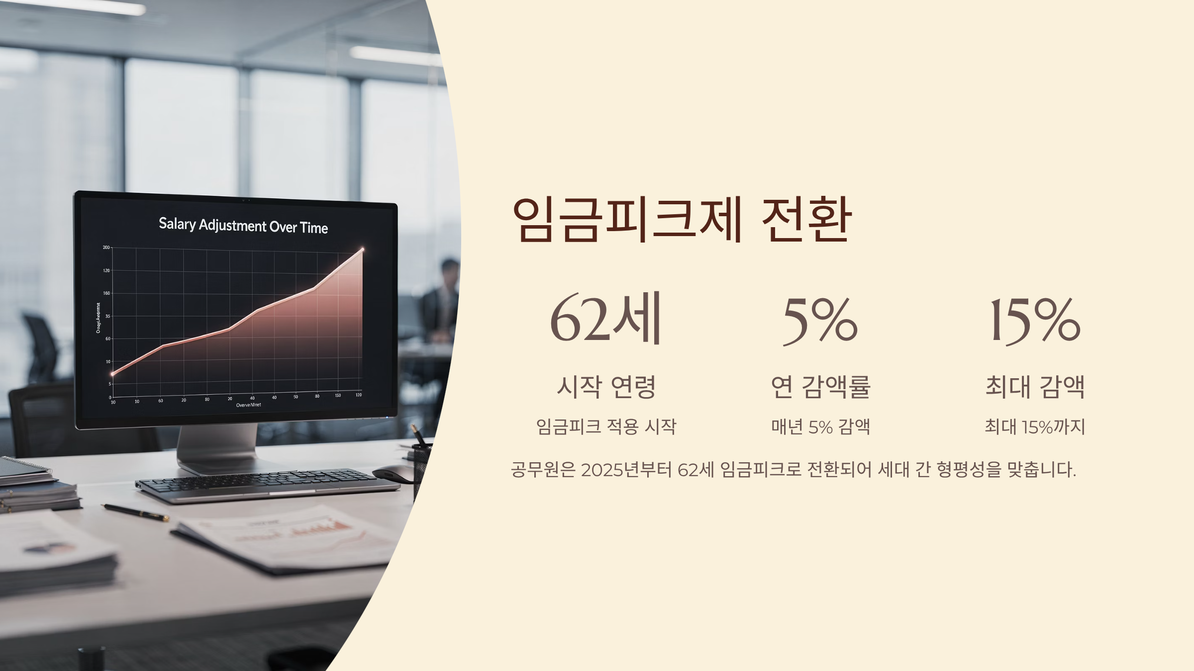 공무원은 2025년부터 62세 임금피크(연 5% 감액, 최대 15%)로 전환되어 세대 간 형평성을 맞춥니다.