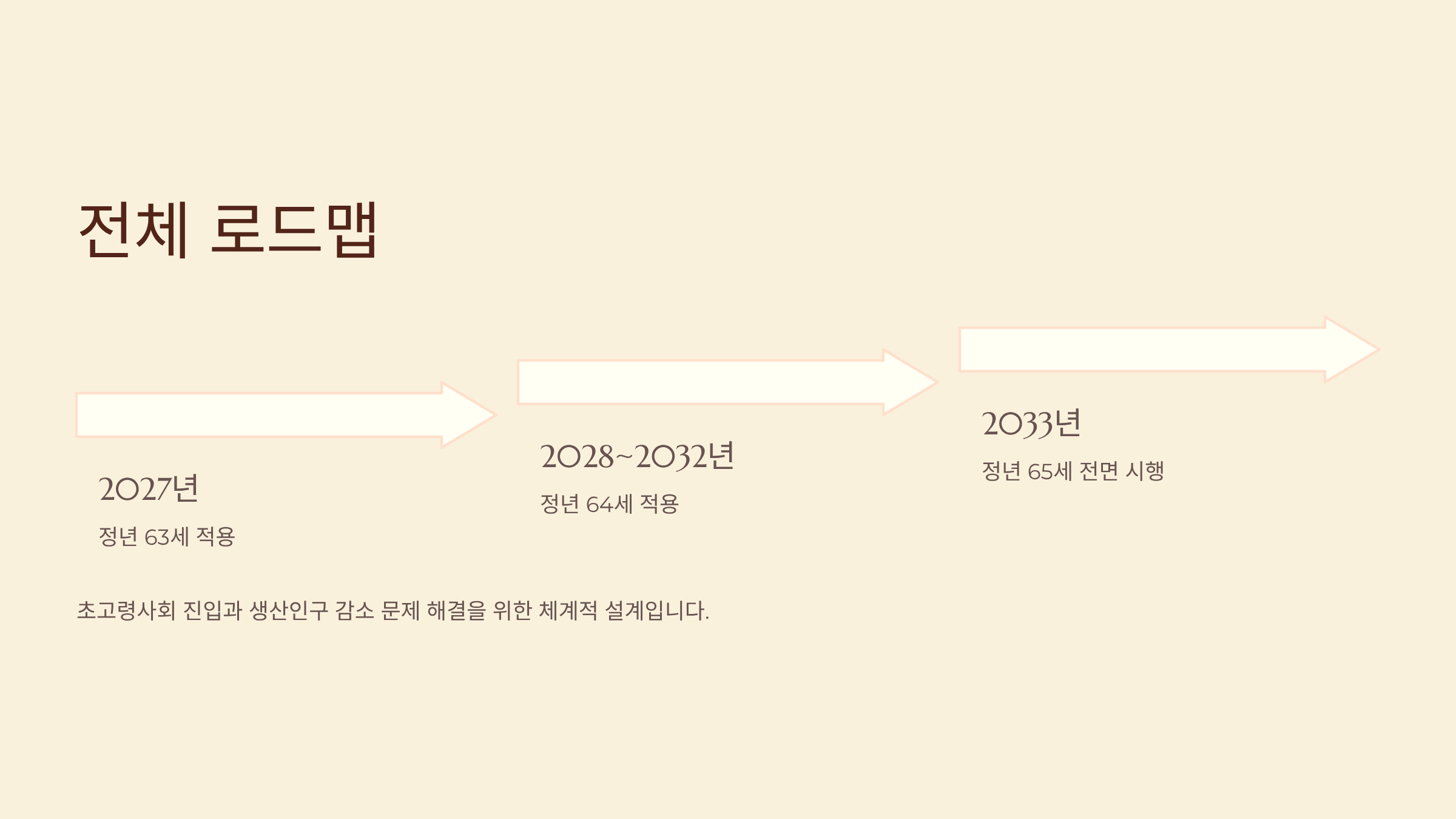 전체 로드맵은 2027년까지 정년 63세, 2028~2032년 64세, 2033년부터 65세 전면 시행으로 설계되었습니다.