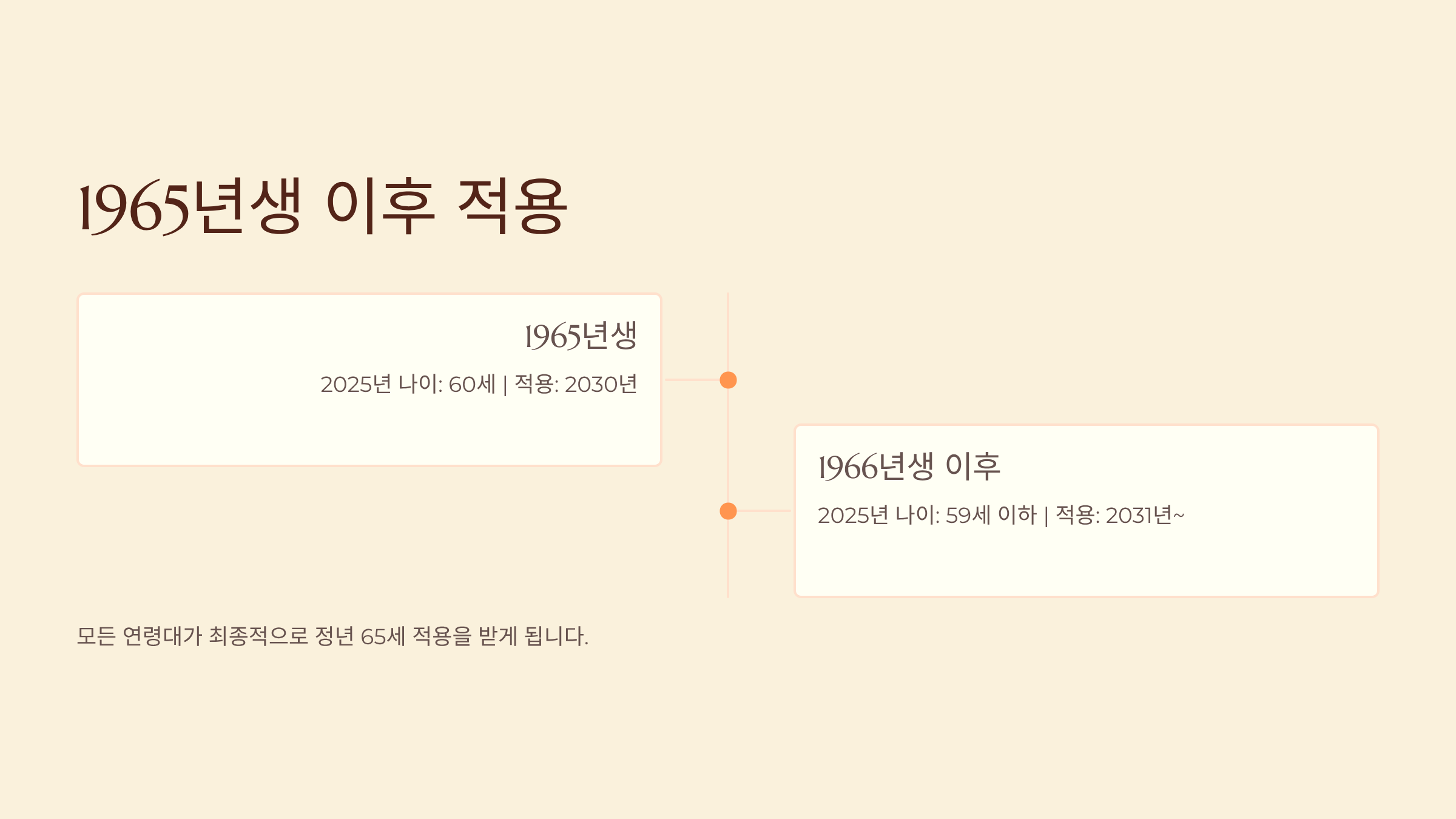 - 출생연도: 1960년생, 2025년 나이: 65세, 적용 시점: 2025년 즉시, 정년: 65세