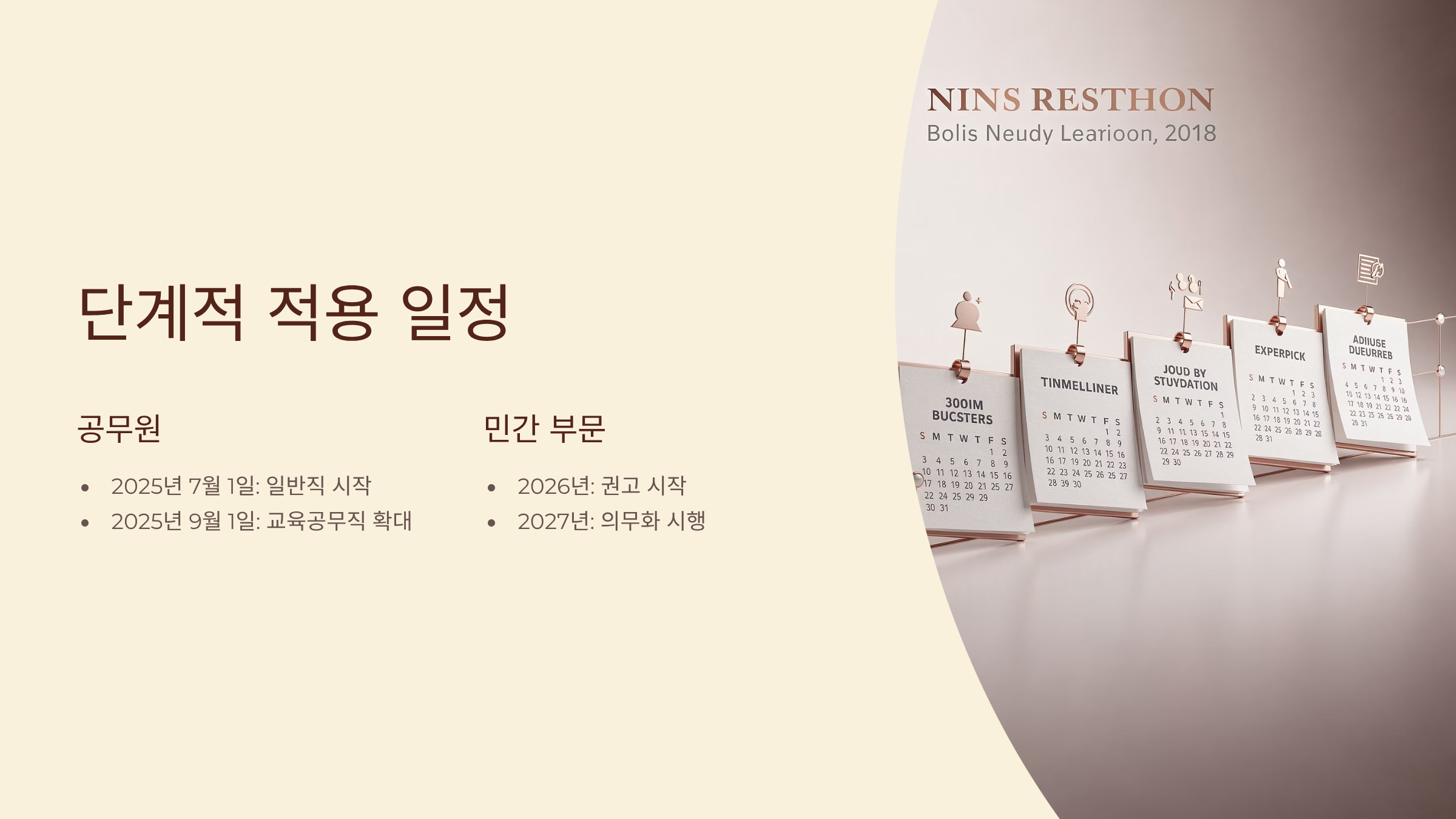 - 단계적 시행: 2025년 공무원 시범 → 2026년 공공기관 → 2027년 민간 권고