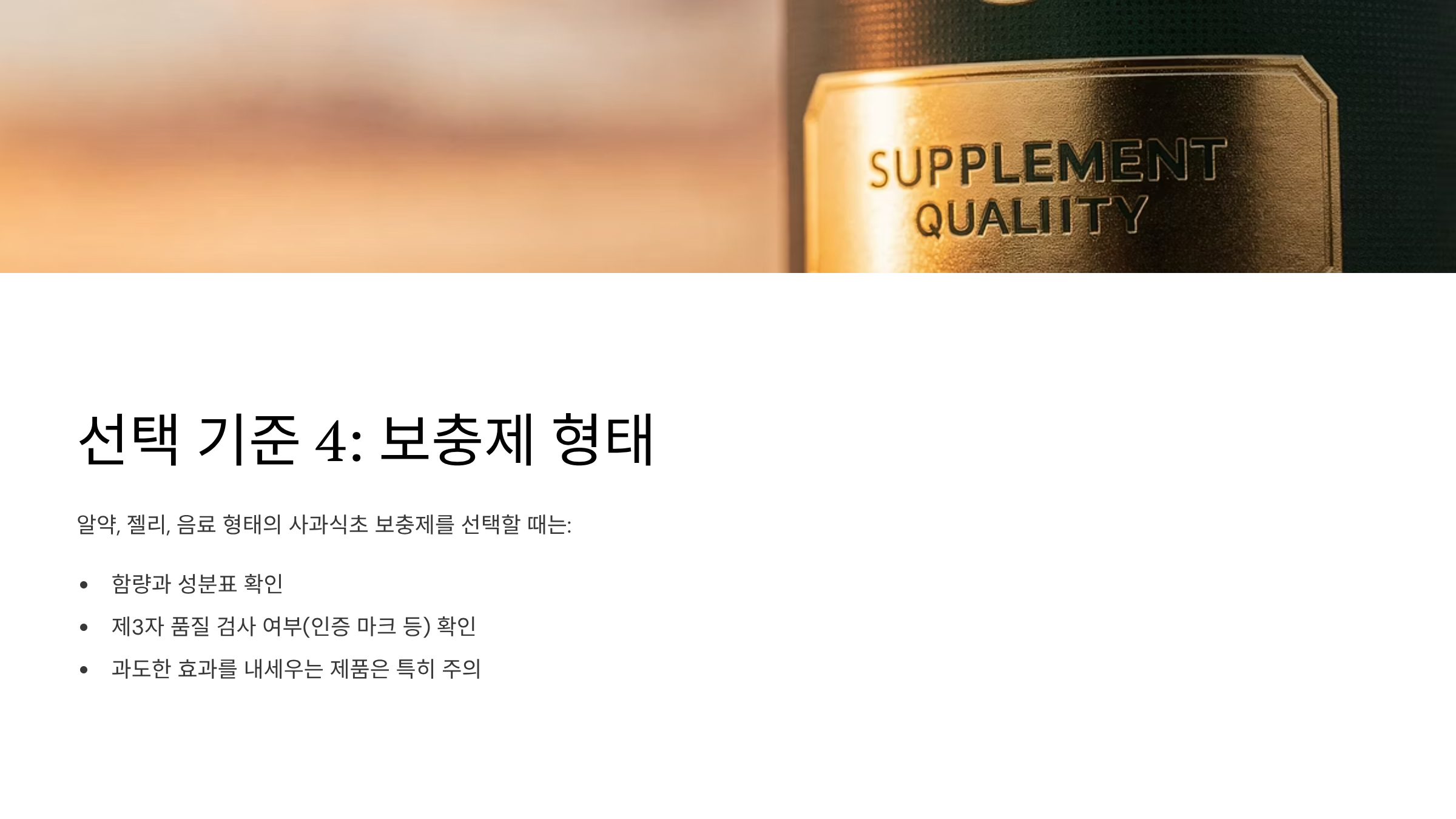 알약, 젤리, 음료 형태의 사과식초 보충제를 선택할 때는, 함량과 성분표, 제3자 품질 검사 여부(인증 마크 등)를 확인하는 것이 안전합니다. 과도한 효과를 내세우는 제품은 특히 주의가 필요합니다.