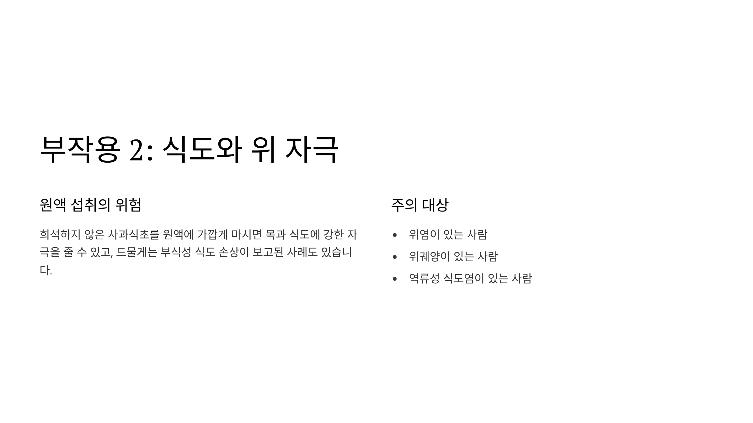 희석하지 않은 사과식초를 원액에 가깝게 마시면 목과 식도에 강한 자극을 줄 수 있고, 드물게는 부식성 식도 손상이 보고된 사례도 있습니다. 위염이나 위궤양이 있는 사람, 역류성 식도염이 있는 사람은 자극이 더 심해질 수 있습니다.