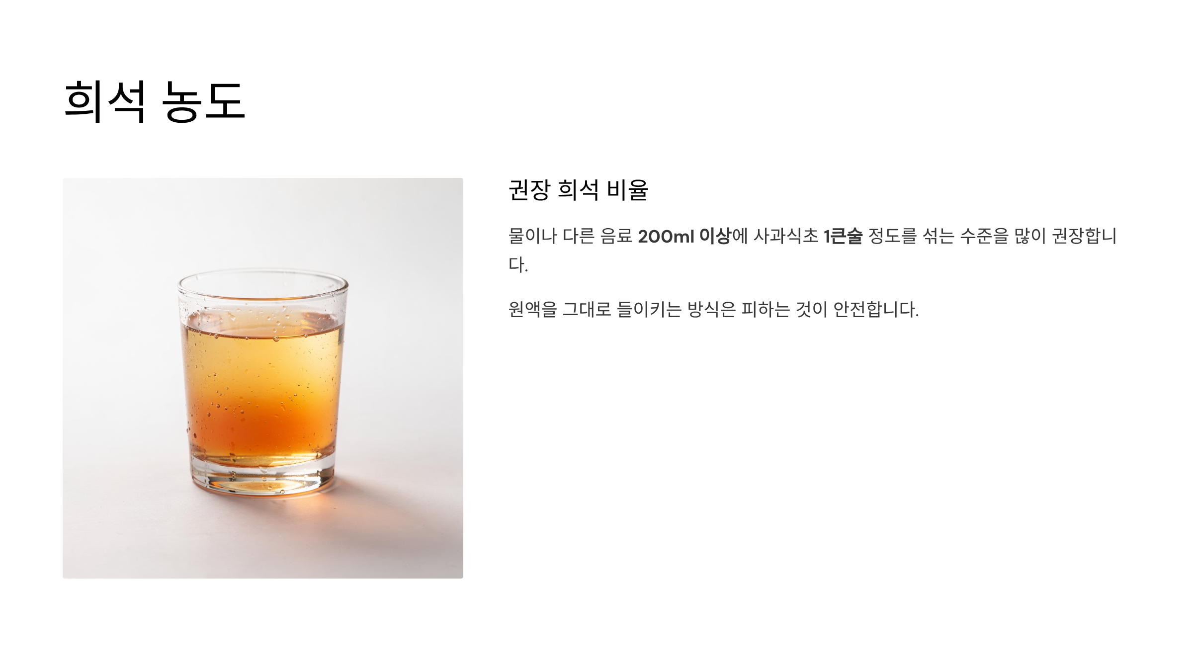 일반적으로 물이나 다른 음료 200밀리리터 이상에 사과식초 1큰술 정도를 섞는 수준을 많이 권장합니다. 원액을 그대로 들이키는 방식은 피하는 것이 안전합니다.