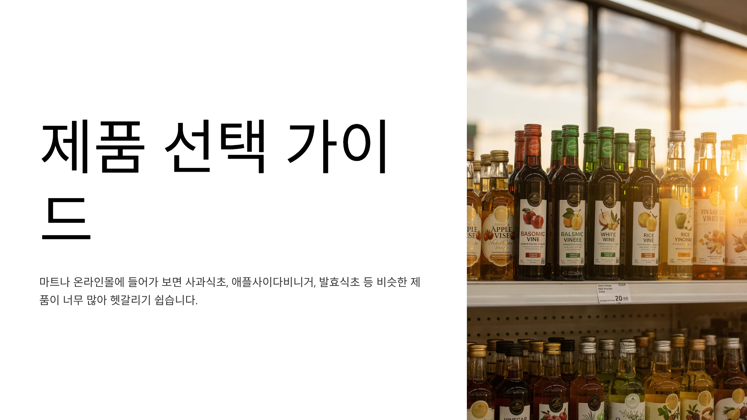 마트나 온라인몰에 들어가 보면 사과식초, 애플사이다비니거, 발효식초 등 비슷한 제품이 너무 많아 헷갈리기 쉽습니다. 기본적으로는 다음 기준만 체크해도 큰 틀에서 잘못 고를 가능성을 줄일 수 있습니다.