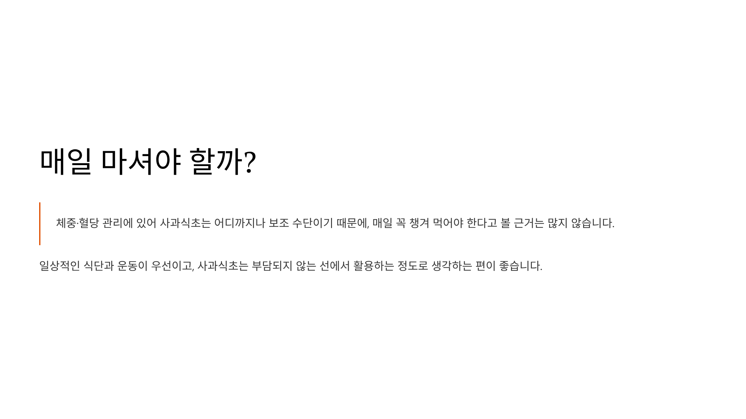 체중·혈당 관리에 있어 사과식초는 어디까지나 보조 수단이기 때문에, 매일 꼭 챙겨 먹어야 한다고 볼 근거는 많지 않습니다. 일상적인 식단과 운동이 우선이고, 사과식초는 부담되지 않는 선에서 활용하는 정도로 생각하는 편이 좋습니다.