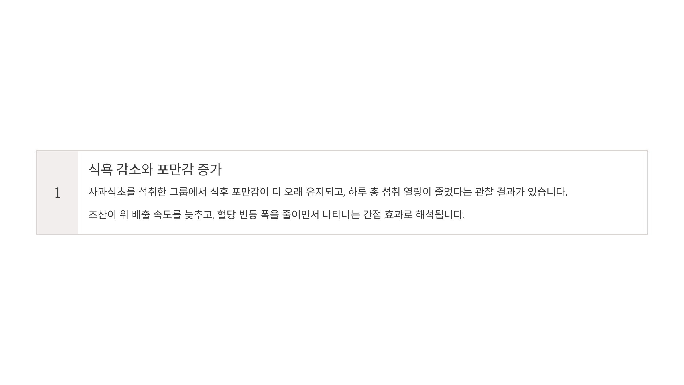 사과식초를 섭취한 그룹에서 식후 포만감이 더 오래 유지되고, 하루 총 섭취 열량이 줄었다는 관찰 결과도 있습니다. 이는 초산이 위 배출 속도를 늦추고, 혈당 변동 폭을 줄이면서 나타나는 간접 효과로 해석됩니다.