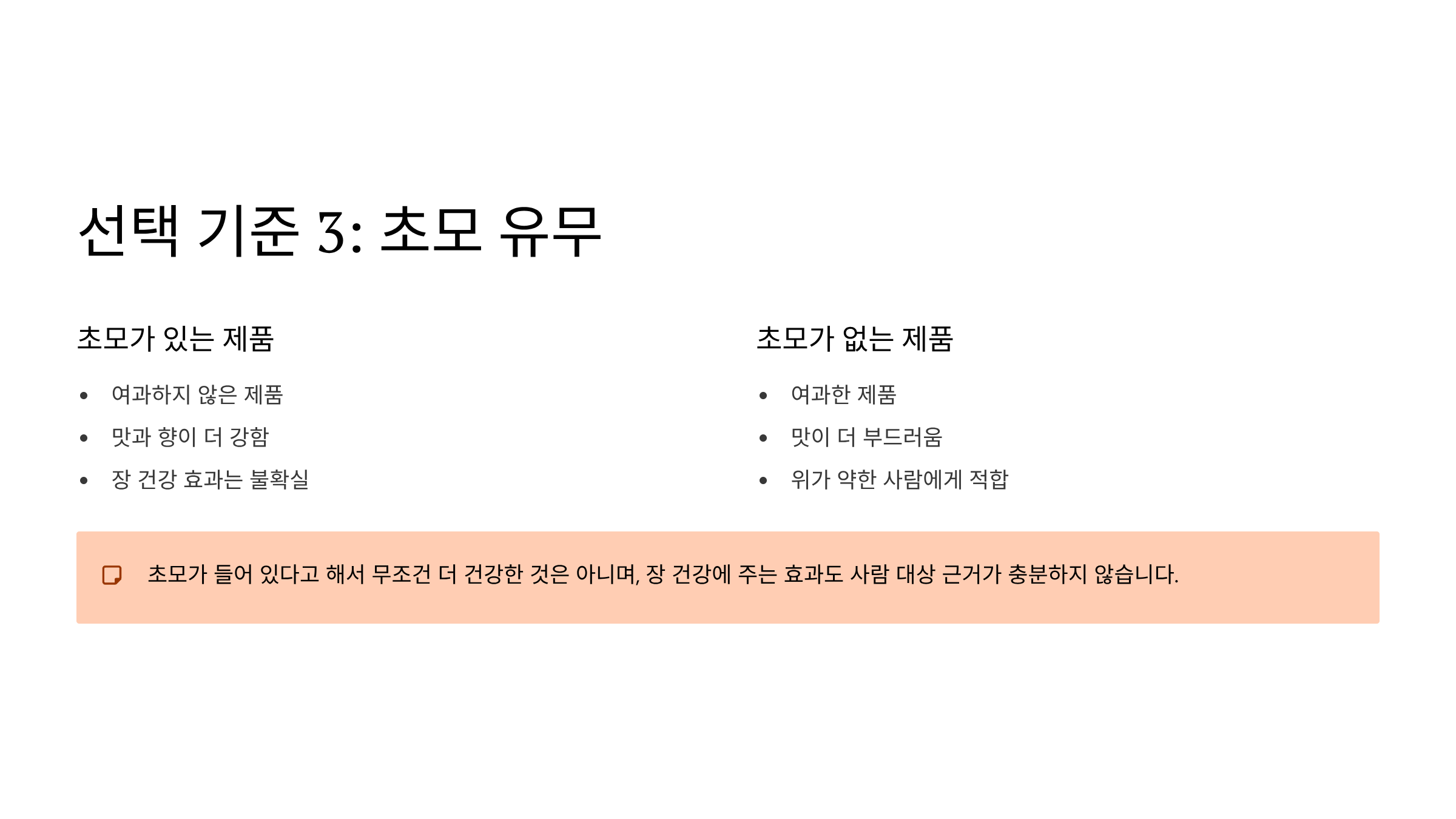 초모가 들어 있다고 해서 무조건 더 건강한 것은 아니며, 장 건강에 주는 효과도 사람 대상 근거가 충분하지 않습니다. 여과하지 않은 제품은 맛과 향이 더 강할 수 있으니, 위가 약한 사람은 오히려 부담이 될 수 있습니다.