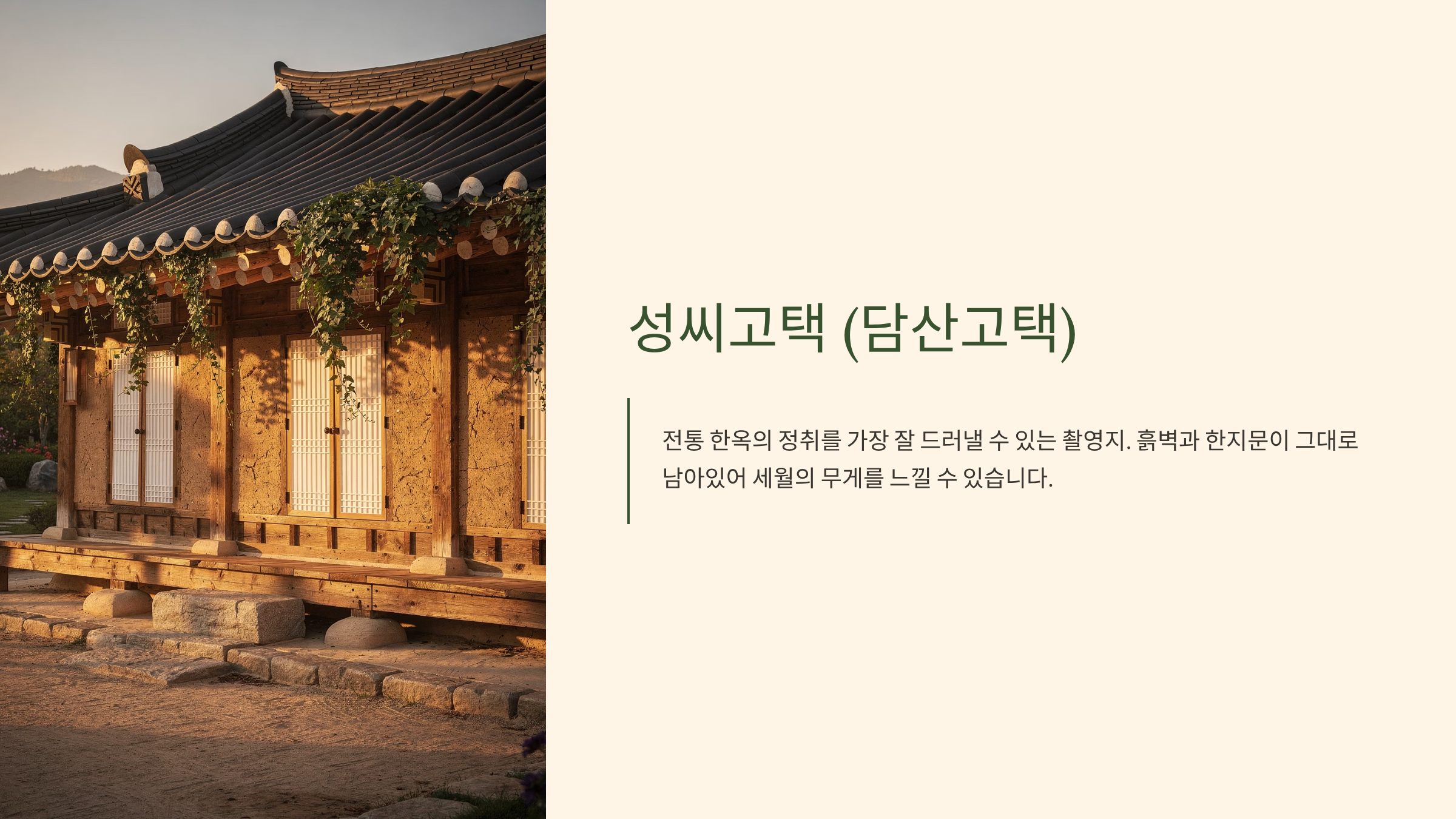 전통 한옥의 정취를 가장 잘 드러낼 수 있는 촬영지로, 흙벽과 한지문이 그대로 남아있어 세월의 무게를 느낄 수 있습니다.