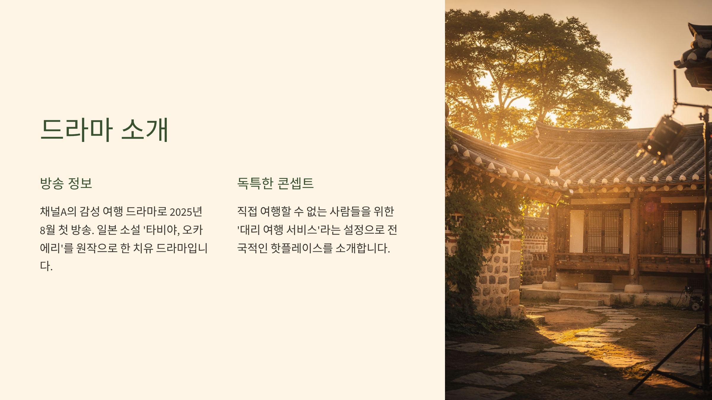 채널A의 감성 여행 드라마 '여행을 대신해 드립니다'가 2025년 8월 첫 방송된 이후, 드라마 속 촬영지들이 전국적인 핫플레이스로 떠올랐습니다. 직접 여행할 수 없는 사람들을 위해 여행을 대신해주는 '대리 여행 서비스'라는 독특한 콘셉트로 시청자들의 마음을 사로잡은 이 드라마는, 일본 소설 '타비야, 오카에리'를 원작으로 합니다.