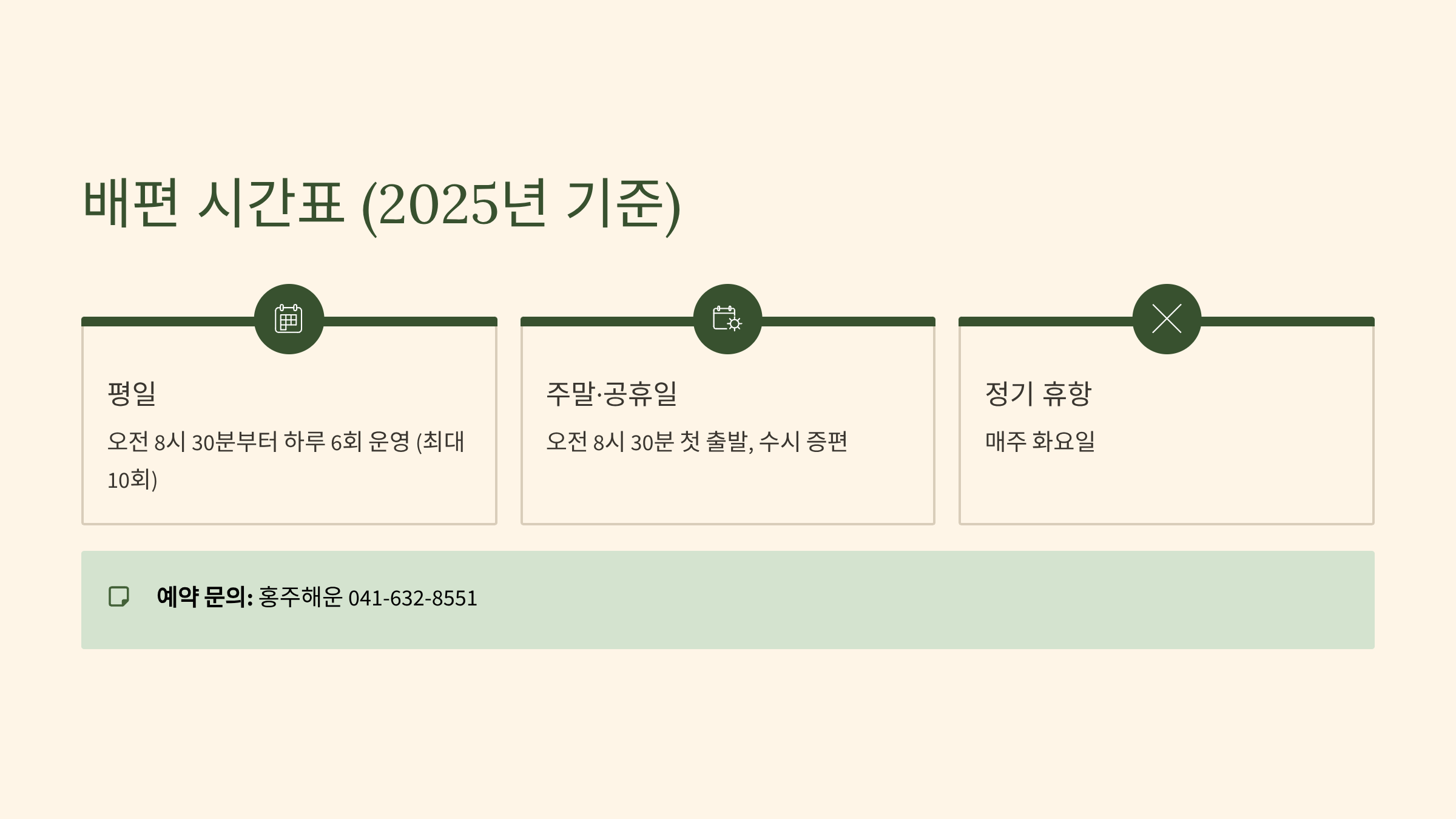 주말·공휴일: 오전 8시 30분 첫 출발, 수시 증편