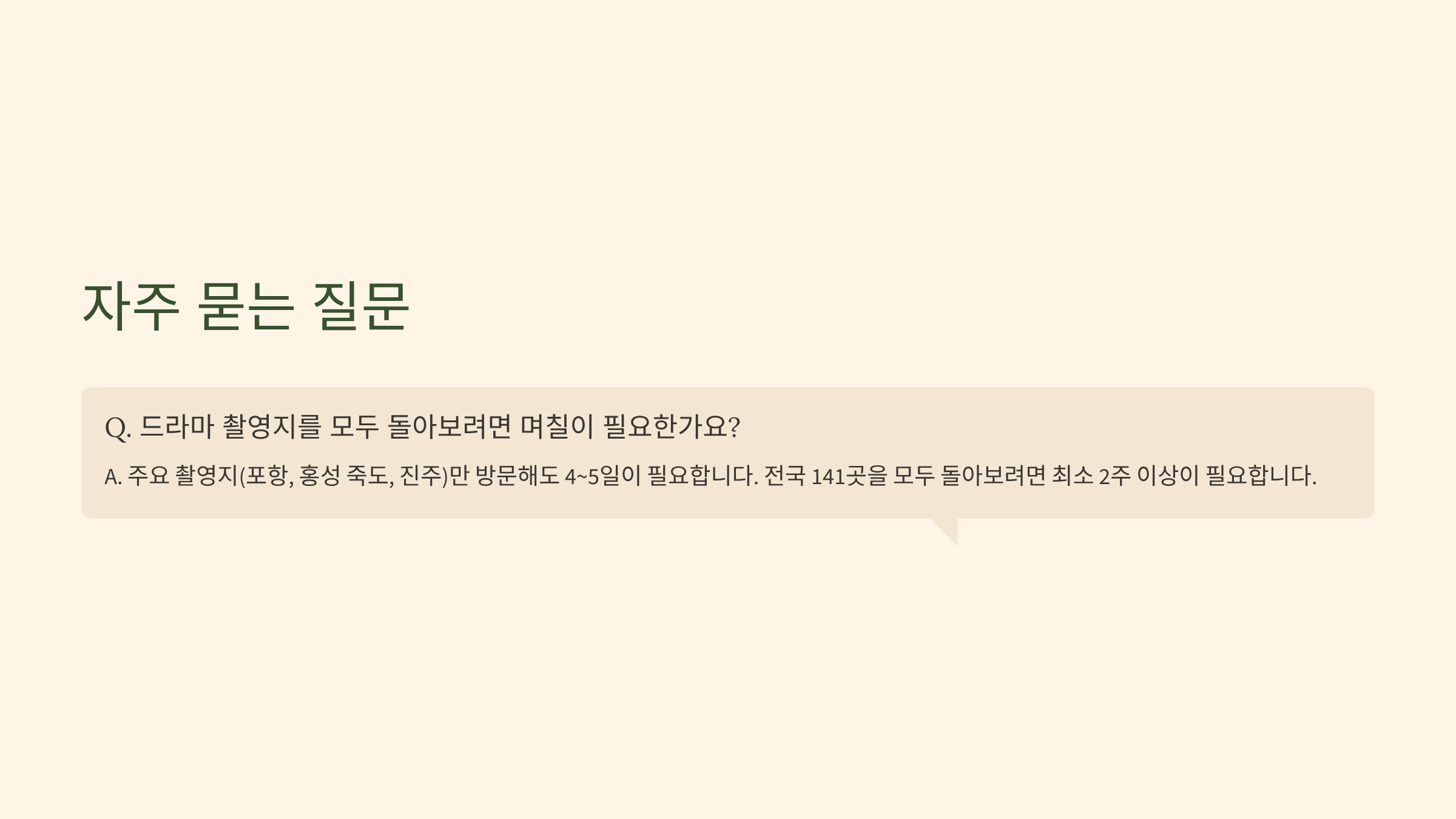 Q. 드라마 촬영지를 모두 돌아보려면 며칠이 필요한가요?