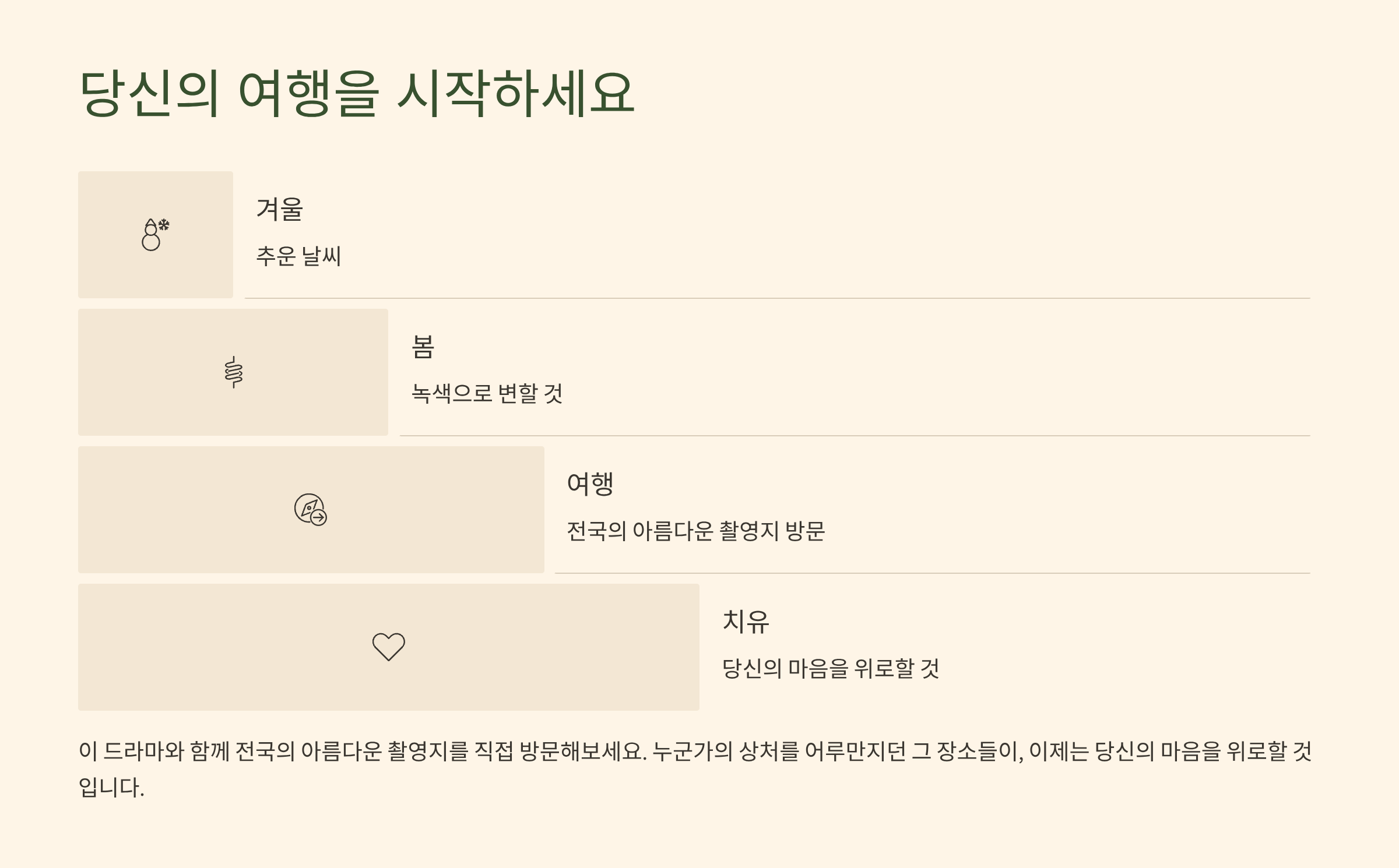 추운 겨울 날씨도 곧 봄이 되면 녹색으로 변할 것입니다. 이 드라마와 함께 전국의 아름다운 촬영지를 직접 방문해보세요. 누군가의 상처를 어루만지던 그 장소들이, 이제는 당신의 마음을 위로할 것입니다.