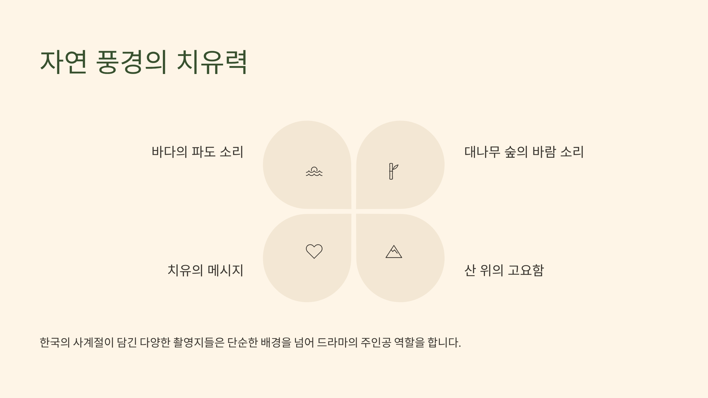한국의 사계절이 담긴 다양한 촬영지들은 단순한 배경을 넘어 드라마의 주인공 역할을 합니다. 바다의 파도 소리, 대나무 숲의 바람 소리, 산 위의 고요함이 모두 '치유'라는 메시지를 전달하고 있습니다.