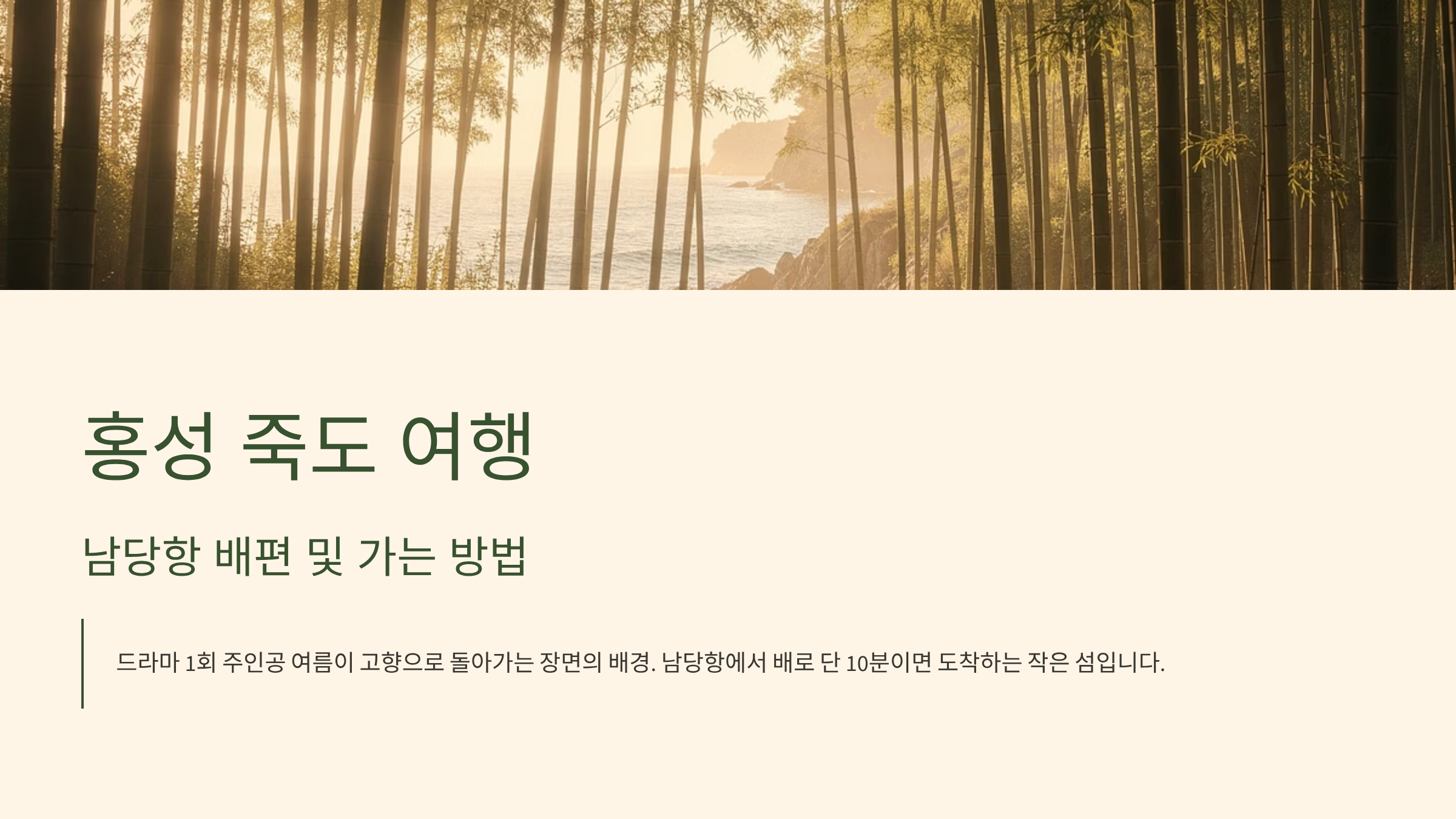 드라마 1회에서 주인공 여름이 고향으로 돌아가는 장면의 배경이 된 죽도는, 실제로는 다큐멘터리 같은 현실감으로 가슴을 미어지게 합니다. 남당항에서 배를 타고 단 10분이면 도착하는 이 작은 섬은 '진짜 여름의 고향'이라는 의미를 담고 있습니다.