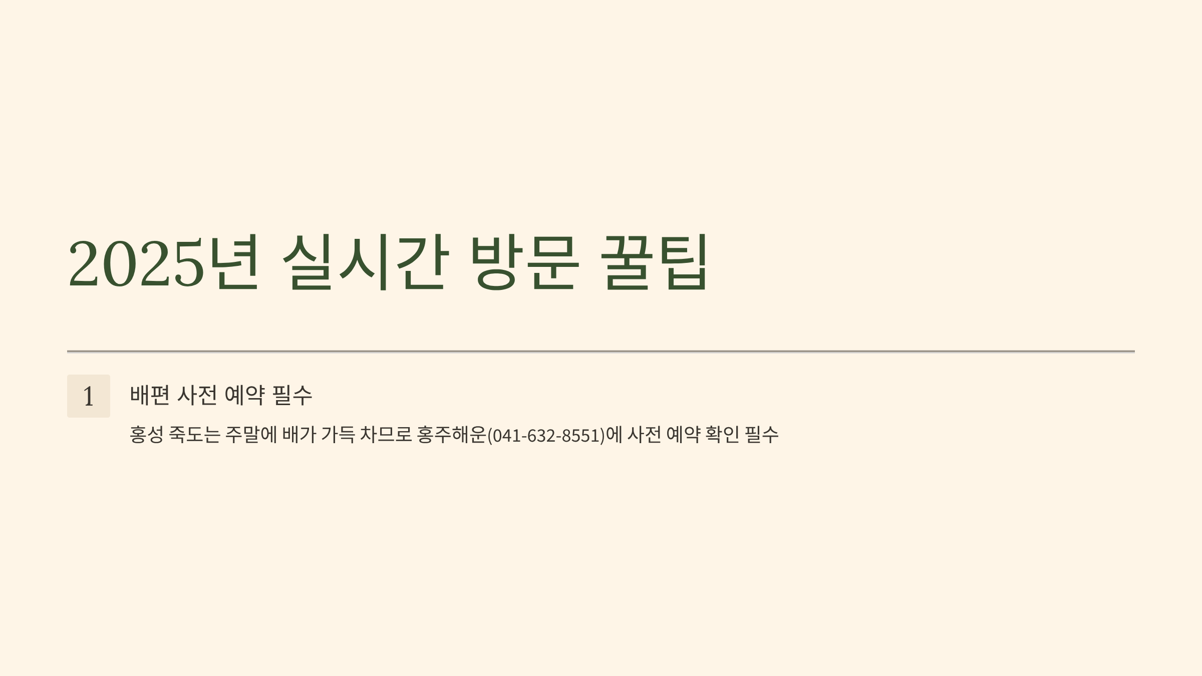 특히 홍성 죽도의 경우 주말에는 배가 가득 찰 정도로 인기를 끌고 있습니다. 사전에 홍주해운에 전화로 예약 가능 인원을 확인하는 것이 좋습니다. 휴대전화: 041-632-8551