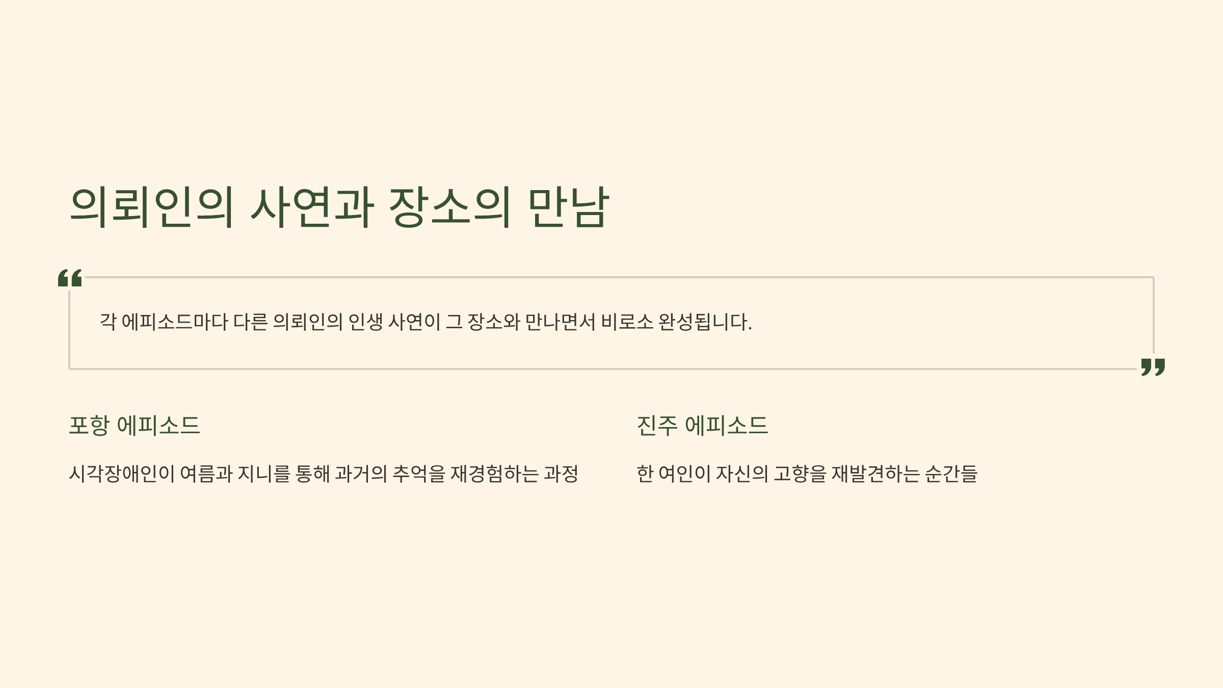 드라마의 감동은 촬영지만으로는 나올 수 없습니다. 각 에피소드마다 다른 의뢰인의 인생 사연이 그 장소와 만나면서 비로소 완성됩니다. 포항의 시각장애인이 여름과 지니를 통해 과거의 추억을 재경험하는 과정, 진주의 한 여인이 자신의 고향을 재발견하는 순간들이 바로 드라마의 핵심입니다.