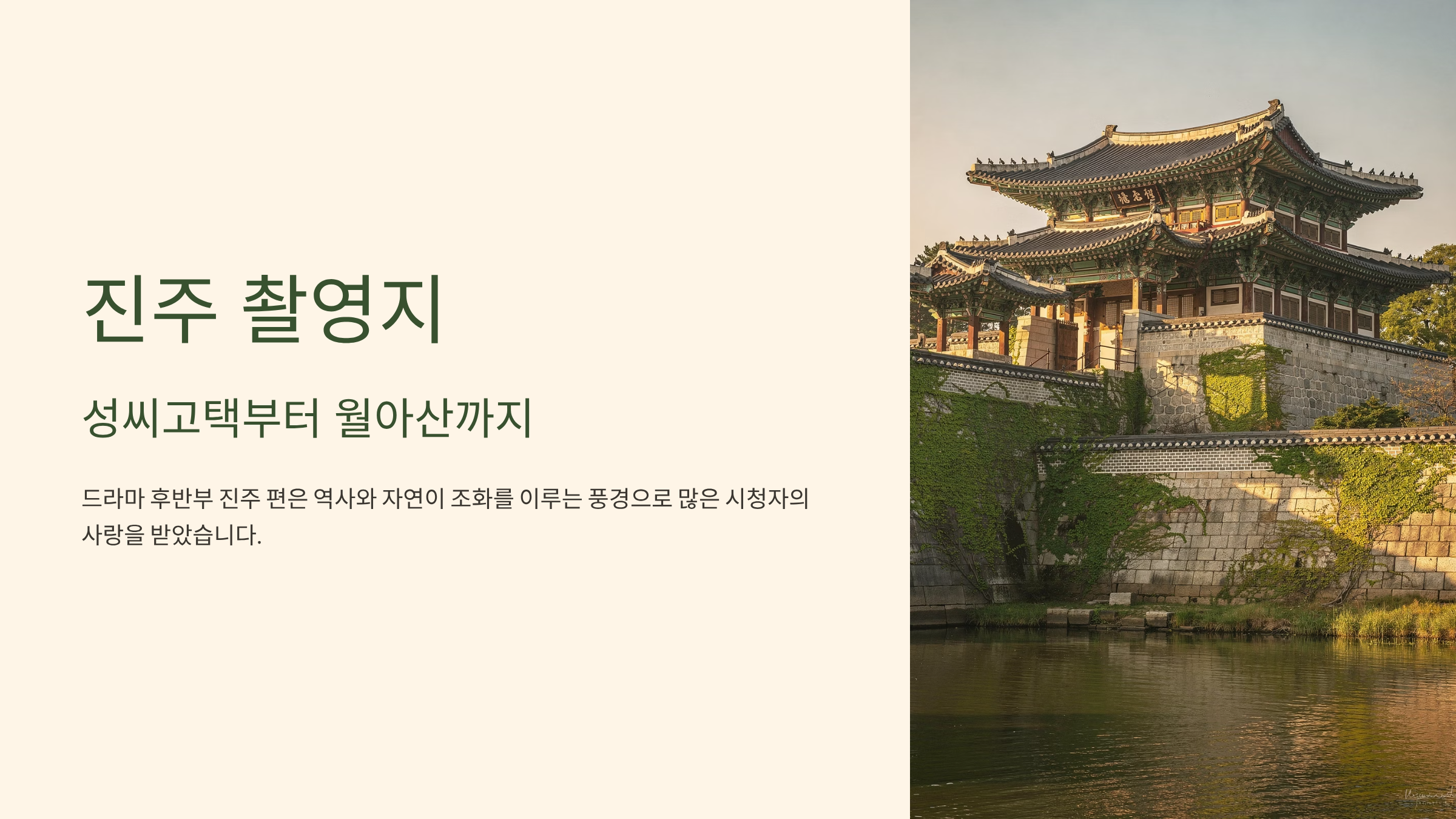 드라마 후반부에 방영된 진주 편은 역사와 자연이 조화를 이루는 풍경으로 많은 시청자의 사랑을 받았습니다. 성씨고택, 진주성, 월아산 등 전통과 현대가 섞인 명소들이 배경이 됩니다.