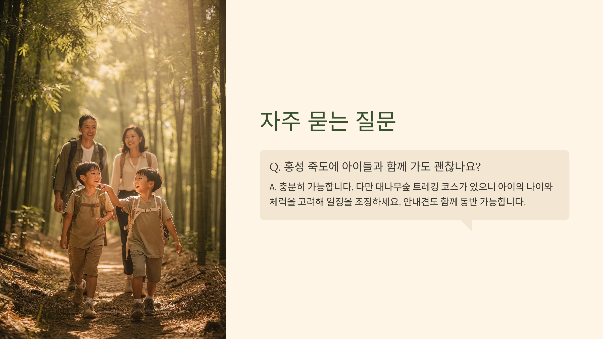 A. 충분히 가능합니다. 다만 대나무숲 트레킹 코스가 있으니 아이의 나이와 체력을 고려해 일정을 조정하세요. 안내견도 함께 동반 가능합니다.
