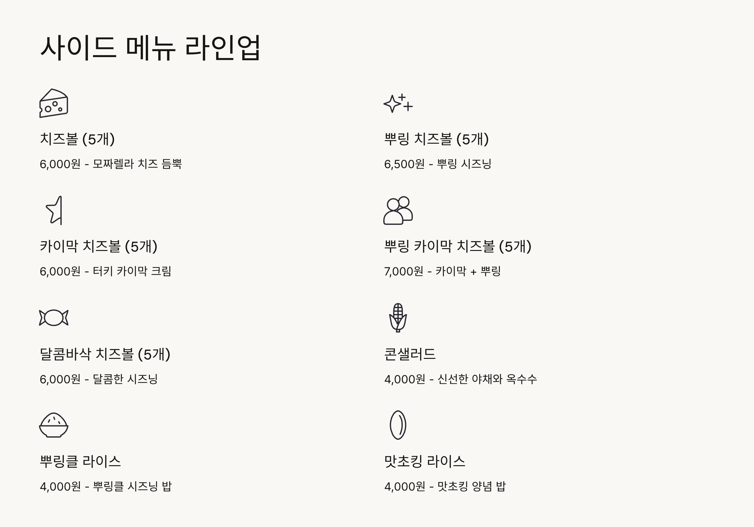 뿌링 치즈볼(5개): 6,500원 (뿌링 시즈닝 입힌 치즈볼)