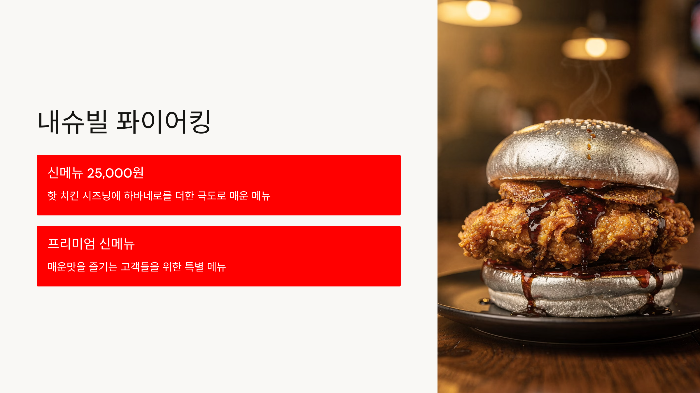 핫 치킨 시즈닝에 하바네로를 더한 극도로 매운 메뉴입니다. 매운맛을 즐기는 고객들을 위한 프리미엄 신메뉴입니다.