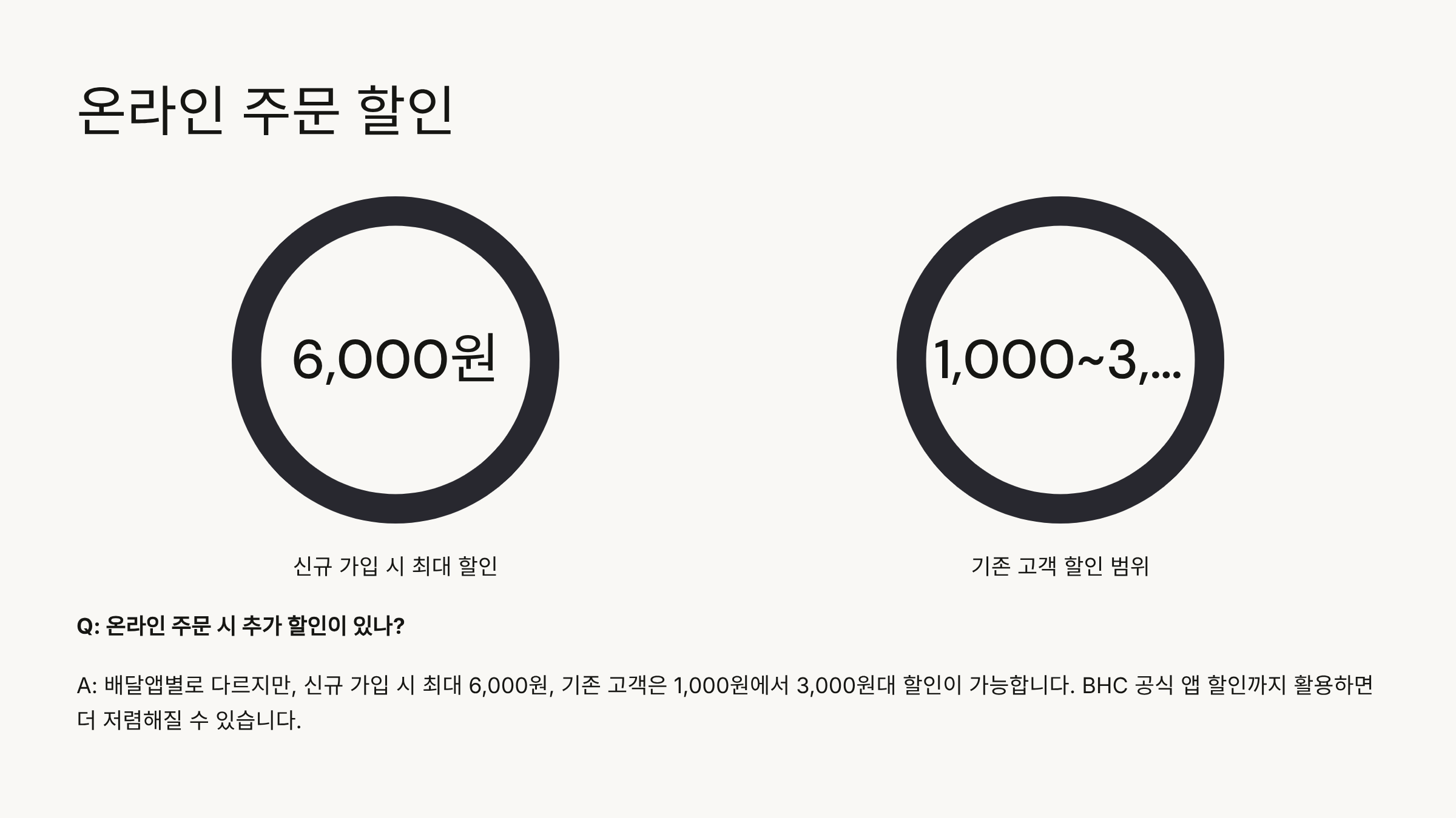 A: 배달앱별로 다르지만, 신규 가입 시 최대 6,000원, 기존 고객은 1,000원에서 3,000원대 할인이 가능합니다. BHC 공식 앱 할인까지 활용하면 더 저렴해질 수 있습니다.
