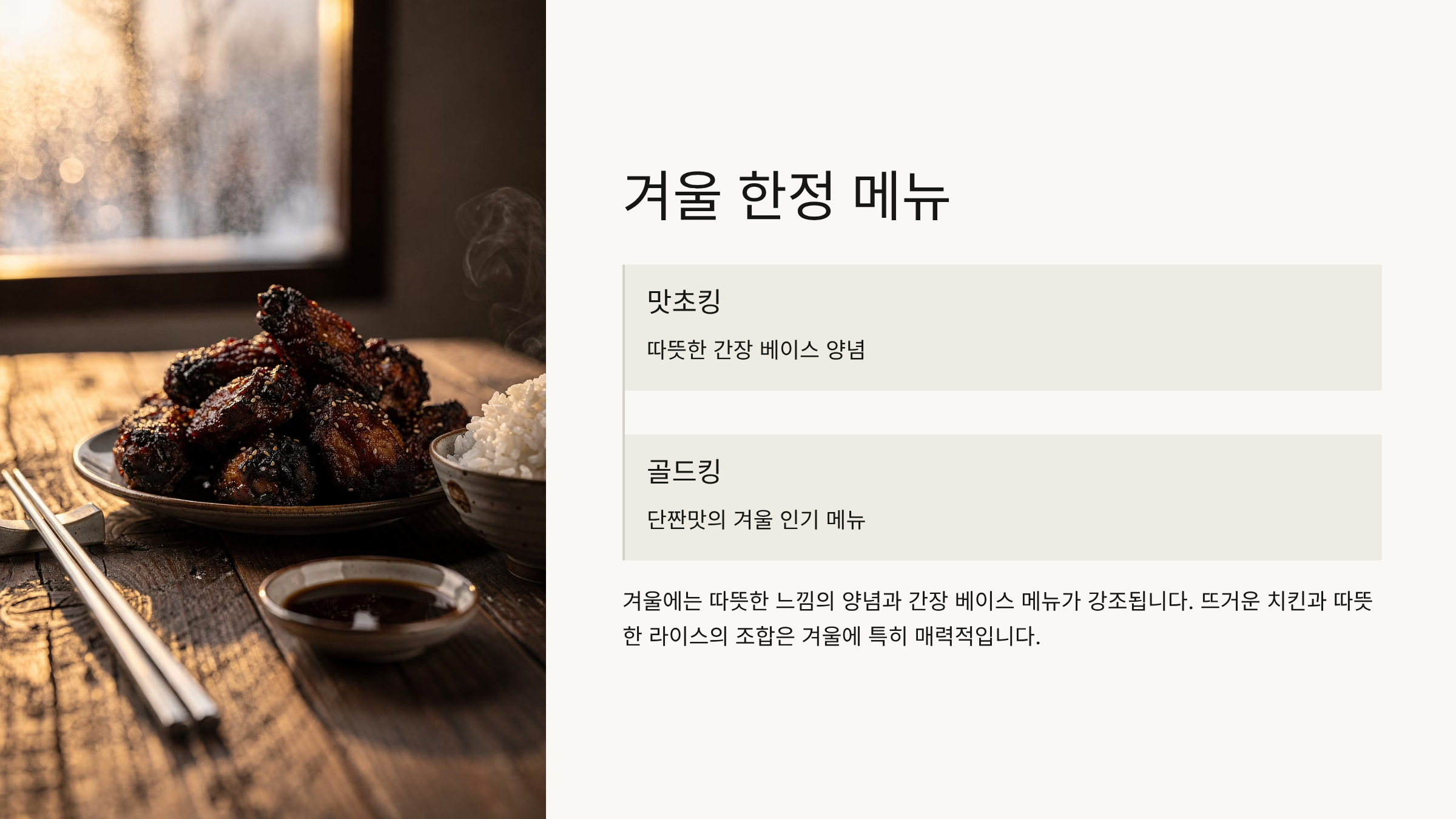 겨울에는 따뜻한 느낌의 양념과 간장 베이스 메뉴가 강조됩니다. 맛초킹, 골드킹 등 단짠맛의 메뉴가 겨울 시즌에 인기를 끌고 있습니다. 뜨거운 치킨과 따뜻한 라이스의 조합은 겨울에 특히 매력적입니다.