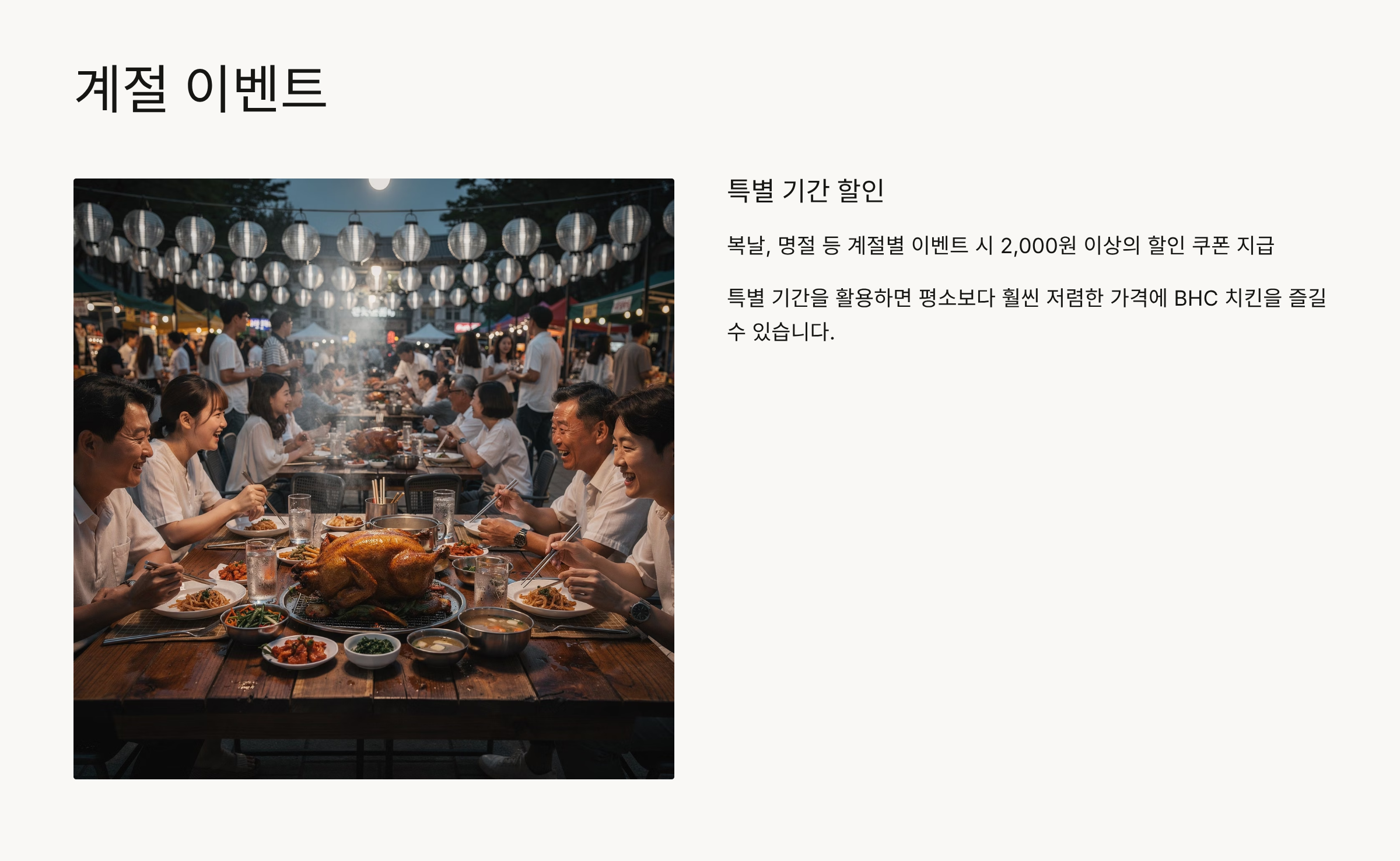 복날, 명절 등 계절별 이벤트 시 2,000원 이상의 할인 쿠폰을 지급합니다. 이런 특별 기간을 활용하면 평소보다 훨씬 저렴한 가격에 BHC 치킨을 즐길 수 있습니다.