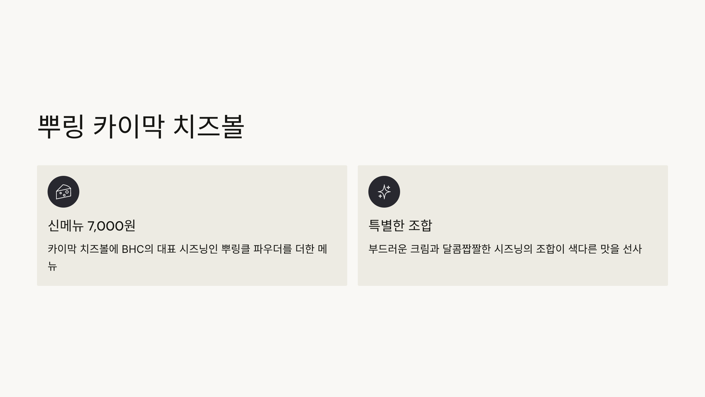 카이막 치즈볼에 BHC의 대표 시즈닝인 뿌링클 파우더를 더한 메뉴로, 부드러운 크림과 달콤짭짤한 시즈닝의 조합이 색다른 맛을 선사합니다.