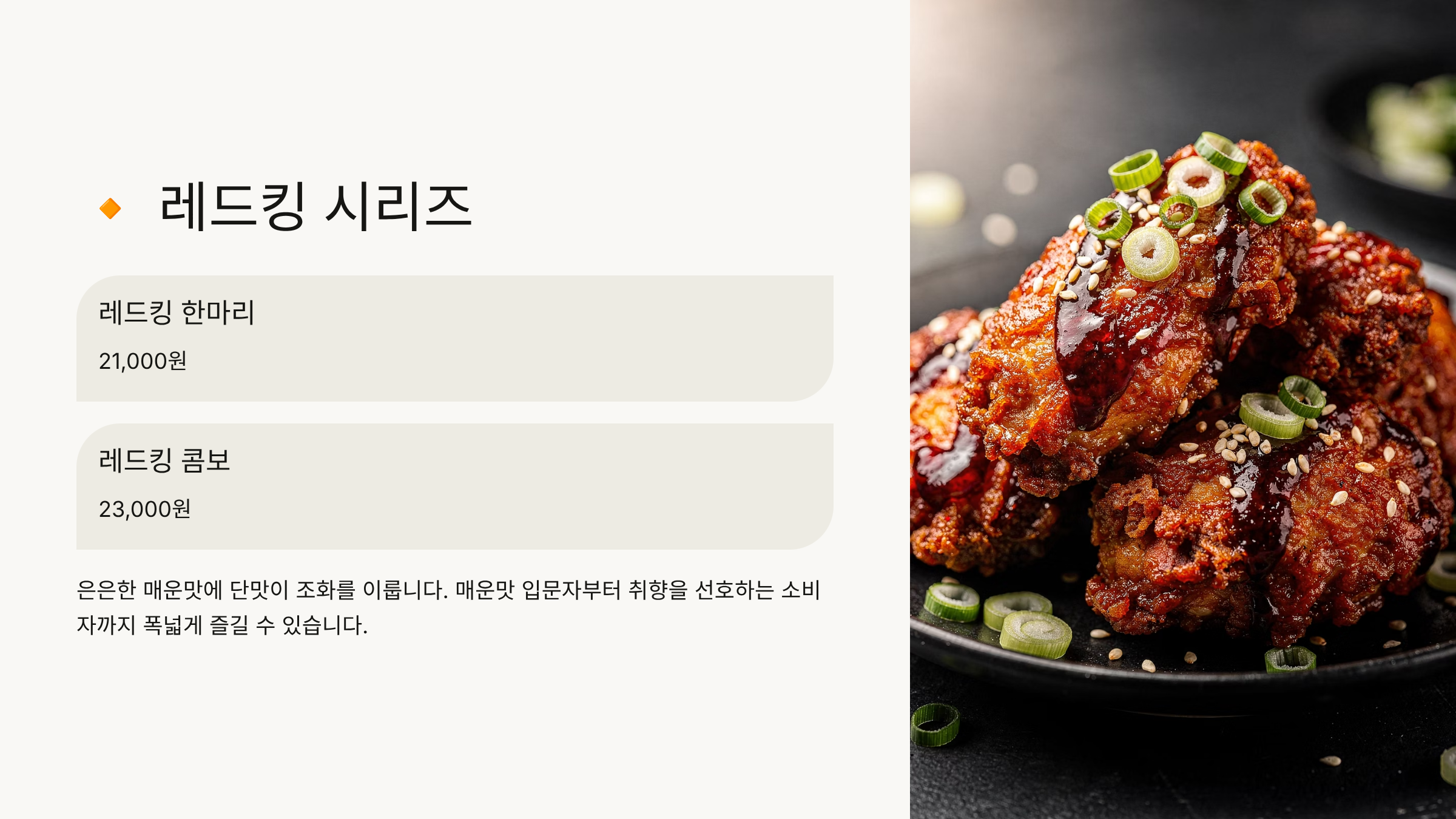 은은한 매운맛에 단맛이 조화를 이룹니다. 레드킹 한마리는 21,000원이고 콤보는 23,000원입니다. 레드킹은 매운맛 입문자부터 취향을 선호하는 소비자까지 폭넓게 즐길 수 있는 메뉴입니다.