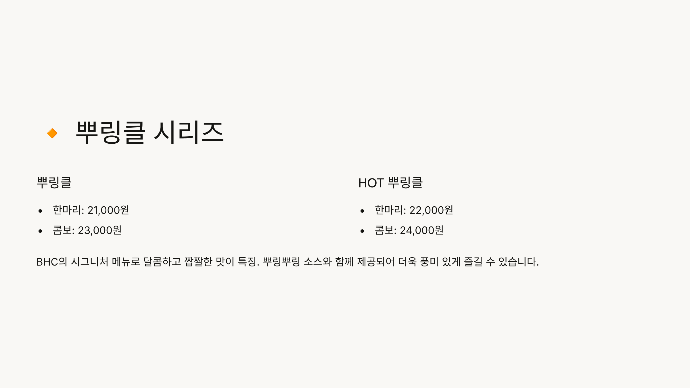 뿌링클: 21,000원 (BHC 대표 메뉴, 달콤짭짤한 시즈닝)