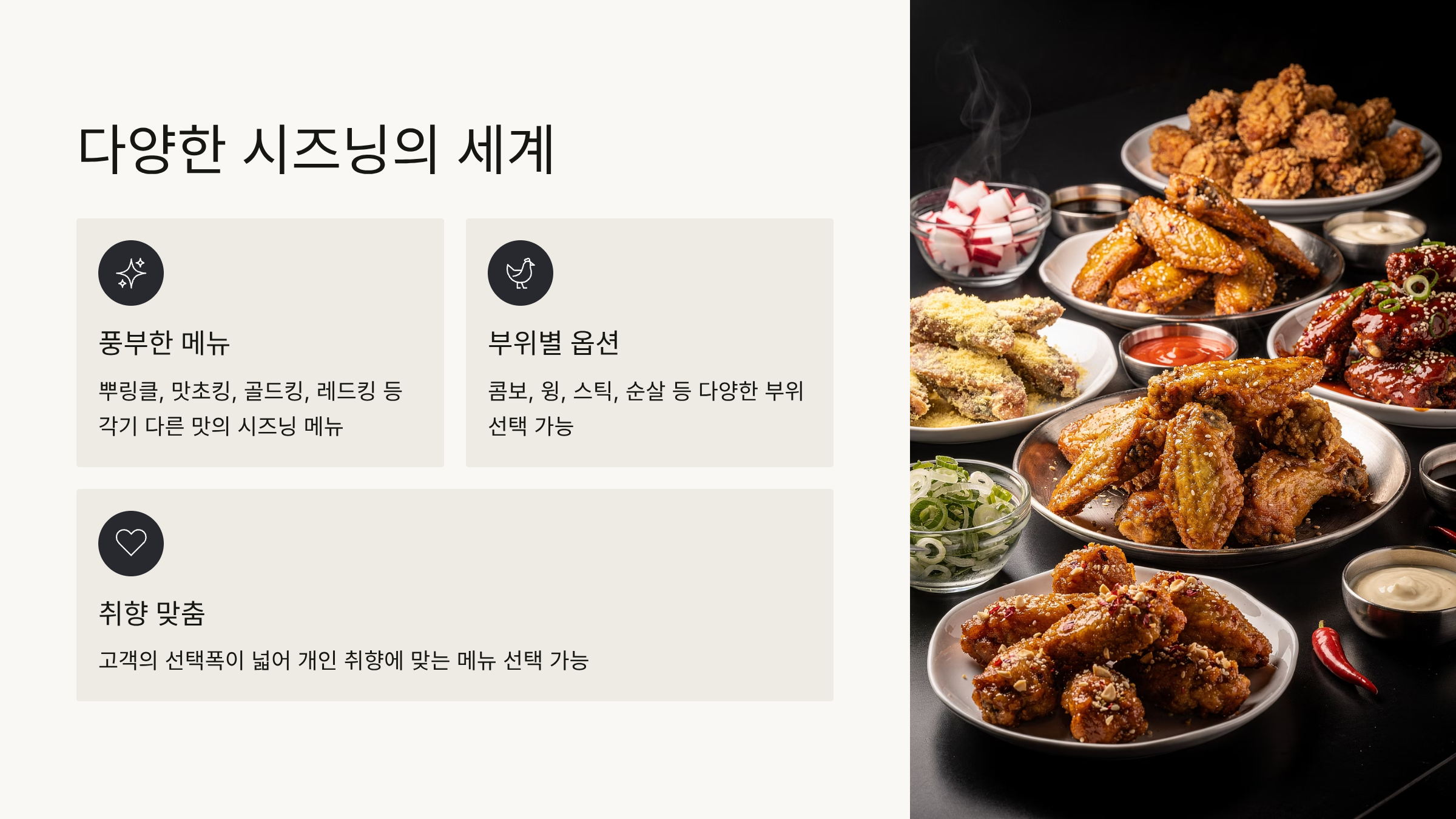 BHC의 특징은 무엇보다도 다양한 시즈닝 메뉴입니다. 단순 후라이드와 양념에서 벗어나 뿌링클, 맛초킹, 골드킹, 레드킹 등 각기 다른 맛의 메뉴들이 있어 취향에 맞는 선택이 가능합니다. 또한 콤보, 윙, 스틱, 순살 등 부위별 옵션도 풍부하여 고객의 선택폭이 넓습니다.