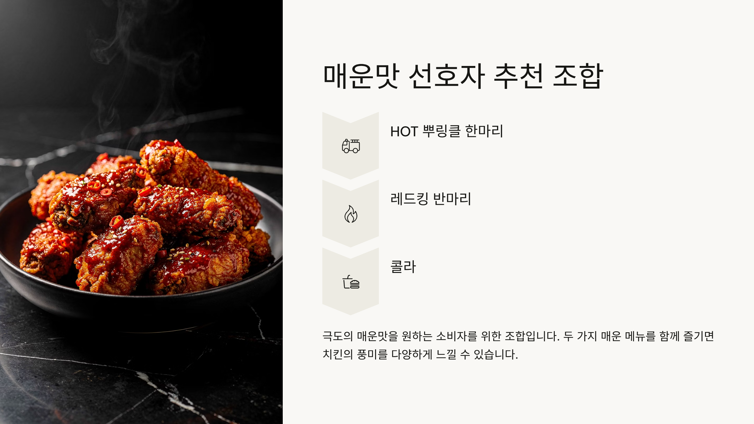 극도의 매운맛을 원하는 소비자를 위한 조합입니다. 두 가지 매운 메뉴를 함께 즐기면 치킨의 풍미를 다양하게 느낄 수 있습니다.
