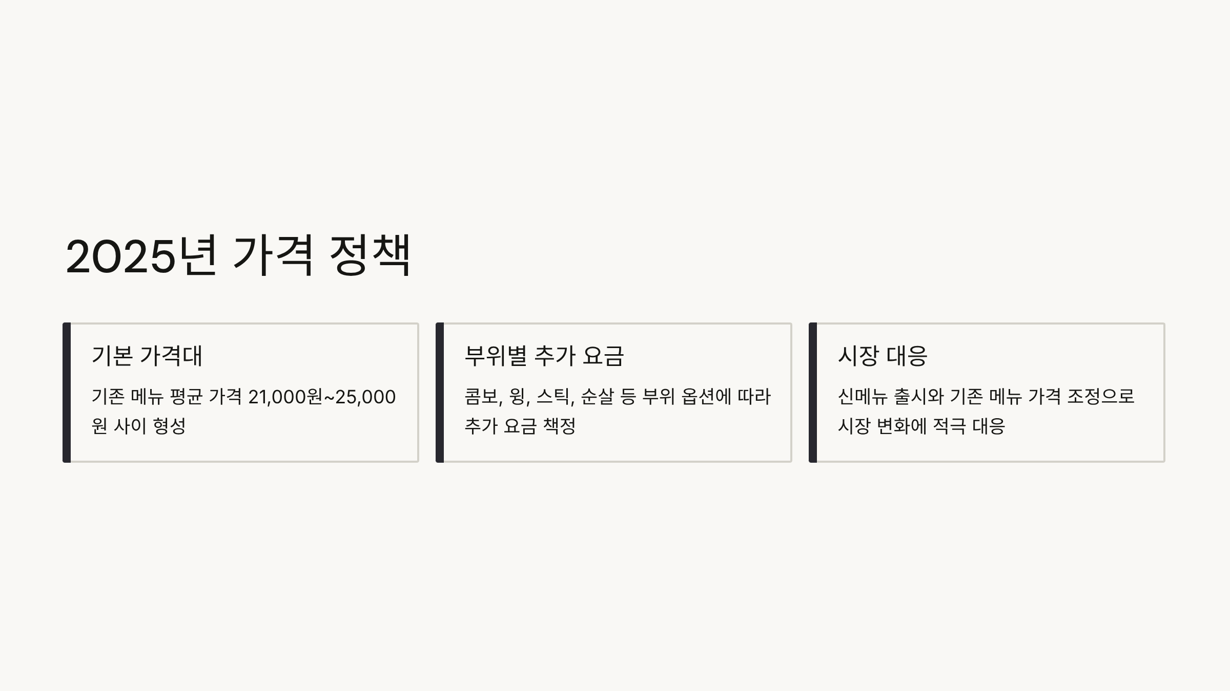 2025년 초반부터 BHC는 신메뉴 출시와 기존 메뉴의 가격 조정을 통해 시장 변화에 대응하고 있습니다. 특히 기존 메뉴의 평균 가격이 21,000원에서 25,000원 사이에서 형성되고 있으며, 부위별 옵션에 따라 추가 요금이 책정되는 구조입니다.