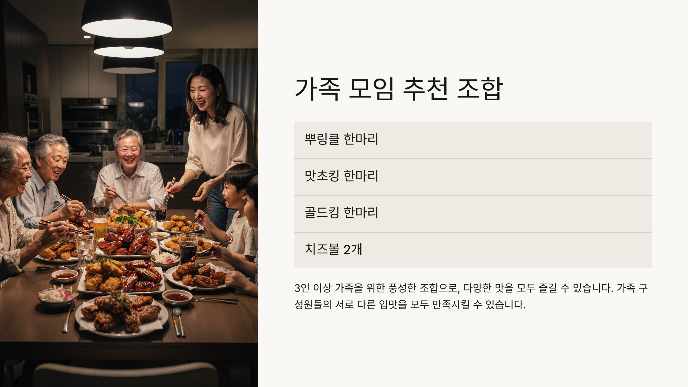 3인 이상 가족을 위한 풍성한 조합으로, 다양한 맛을 모두 즐길 수 있습니다. 가족 구성원들의 서로 다른 입맛을 모두 만족시킬 수 있습니다.