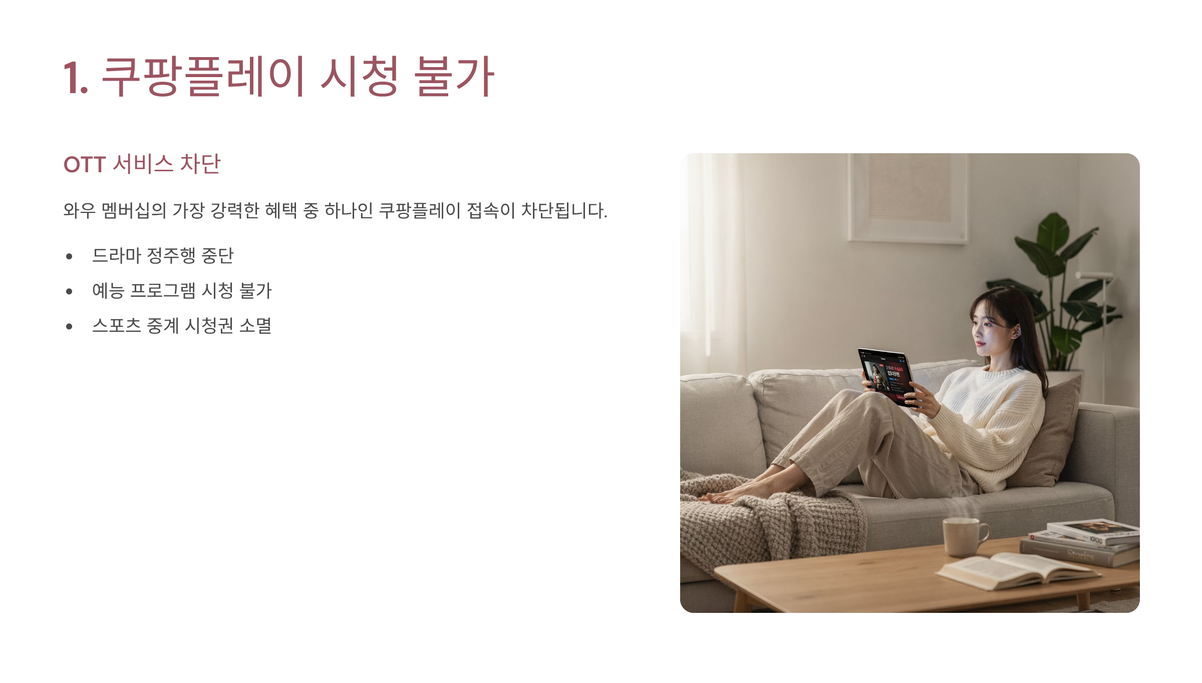 와우 멤버십의 가장 강력한 혜택 중 하나인 OTT 서비스 쿠팡플레이 접속이 차단됩니다. 만약 드라마나 예능 정주행 중이었다면 해지 시점을 신중히 결정해야 합니다. 스포츠 중계 시청권도 함께 사라집니다.