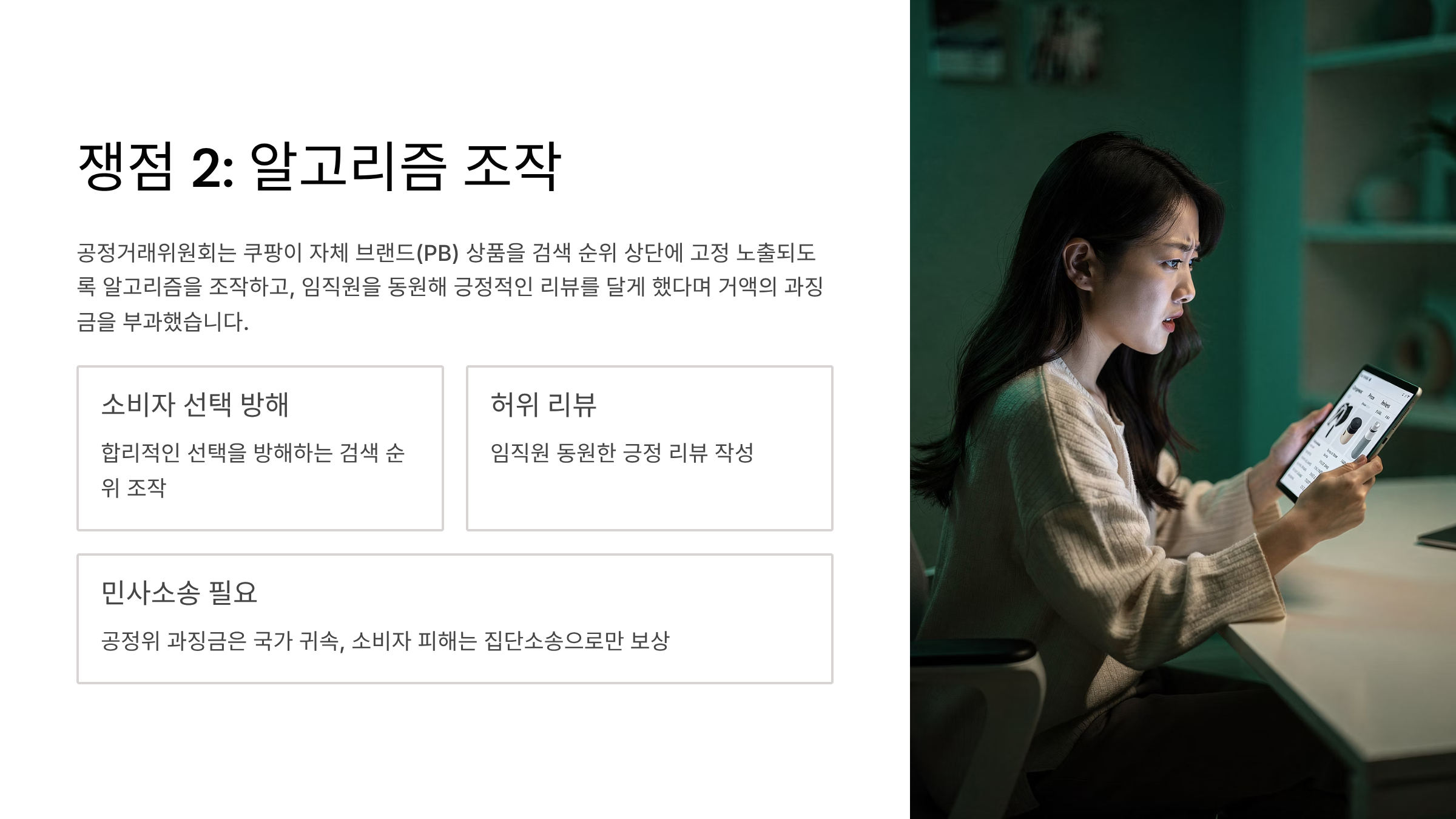 공정거래위원회는 쿠팡이 자체 브랜드(PB) 상품을 검색 순위 상단에 고정 노출되도록 알고리즘을 조작하고, 임직원을 동원해 긍정적인 리뷰를 달게 했다며 거액의 과징금을 부과했습니다. 이는 소비자의 합리적인 선택을 방해하고, 결과적으로 더 비싸거나 품질이 낮은 제품을 구매하게 만든 행위입니다. 공정위의 과징금은 국가로 귀속되지만, 소비자가 입은 피해는 오직 '민사소송(집단소송)'을 통해서만 보상받을 수 있습니다.