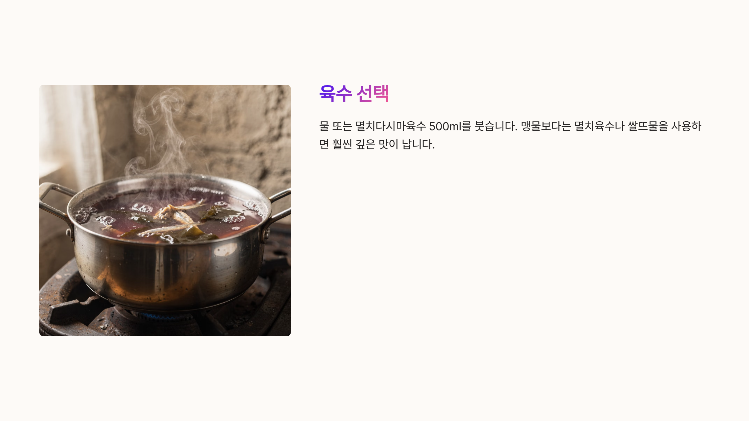 물 또는 멸치다시마육수 500ml (종이컵 3컵 정도)