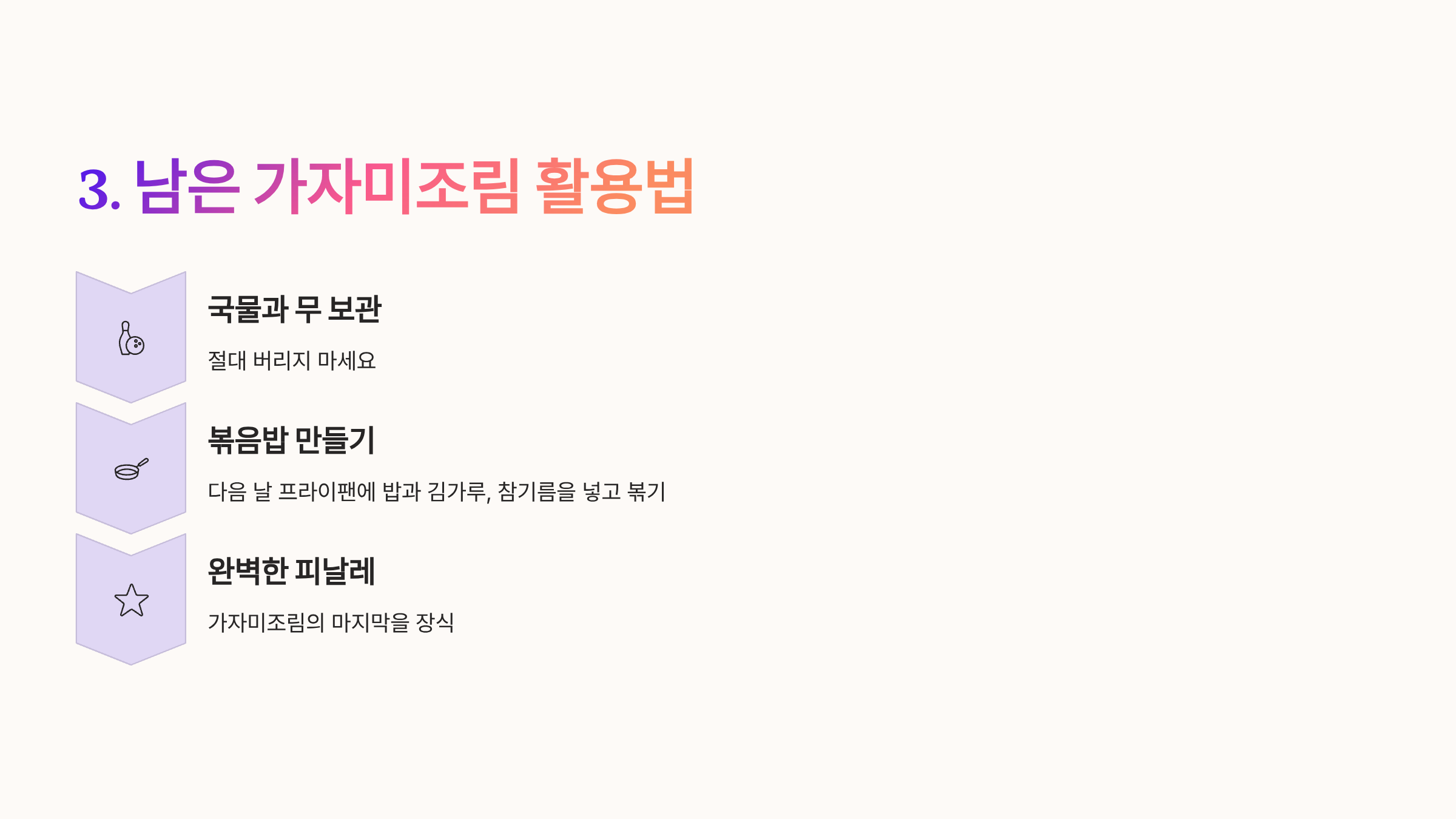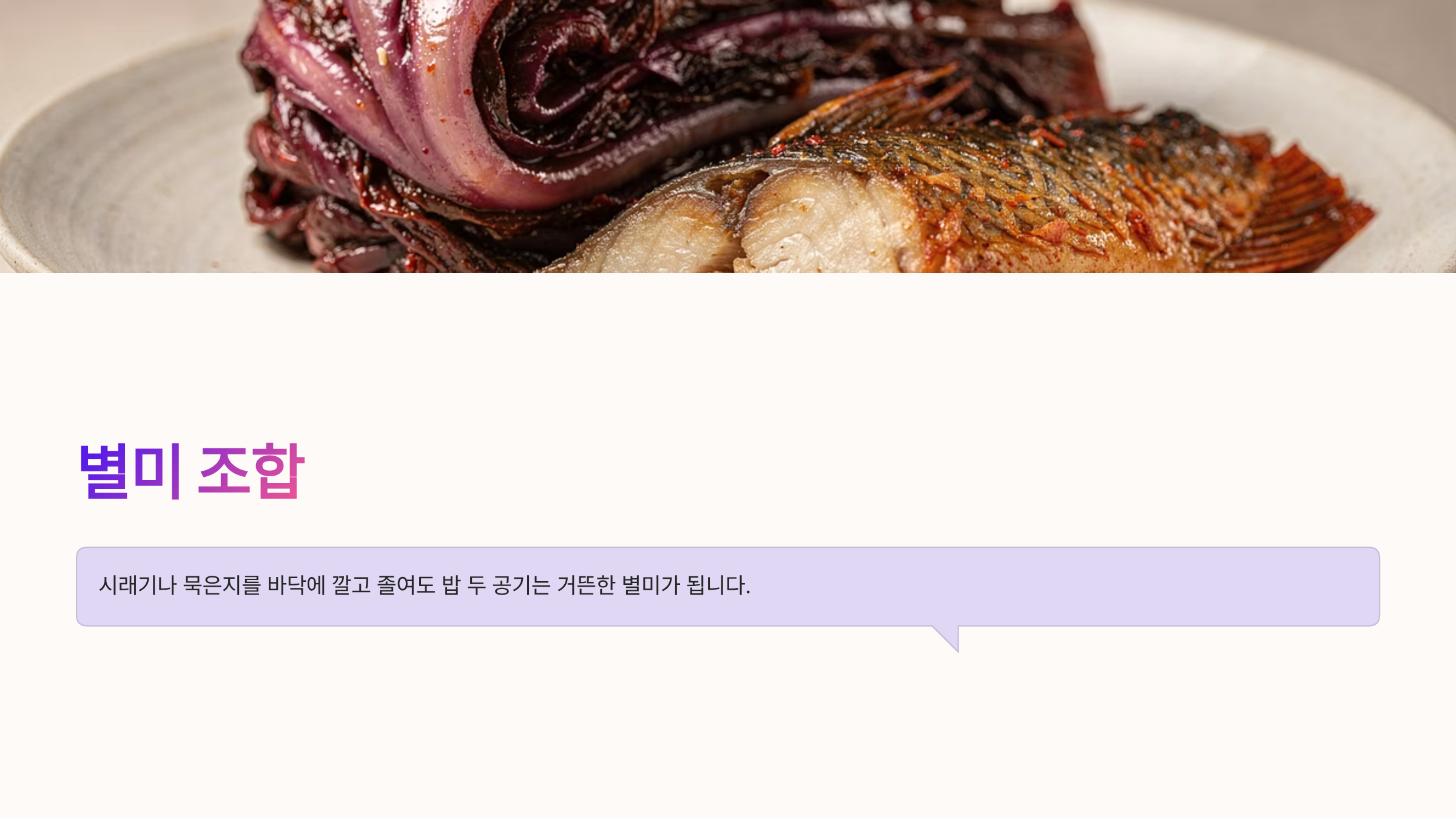 남은 국물과 무는 절대 버리지 마세요. 다음 날 프라이팬에 밥과 김가루, 참기름을 넣고 볶음밥을 만들어 드시면 가자미조림의 피날레를 완벽하게 장식할 수 있습니다.
