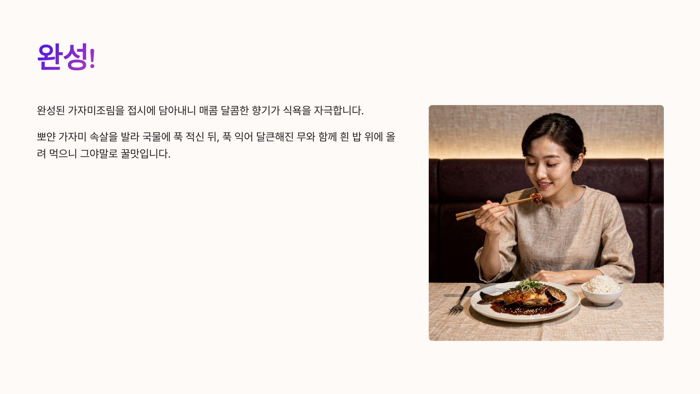 완성된 가자미조림을 접시에 담아내니 매콤 달콤한 향기가 식욕을 자극합니다. 뽀얀 가자미 속살을 발라 국물에 푹 적신 뒤, 푹 익어 달큰해진 무와 함께 흰 밥 위에 올려 먹으니 그야말로 꿀맛입니다. 비린내는 전혀 없고, 된장의 구수함이 더해진 양념장이 가자미의 담백함과 환상적인 조화를 이룹니다. 특히 포슬포슬하게 익은 감자를 으깨서 양념에 비벼 먹는 맛도 일품이네요.