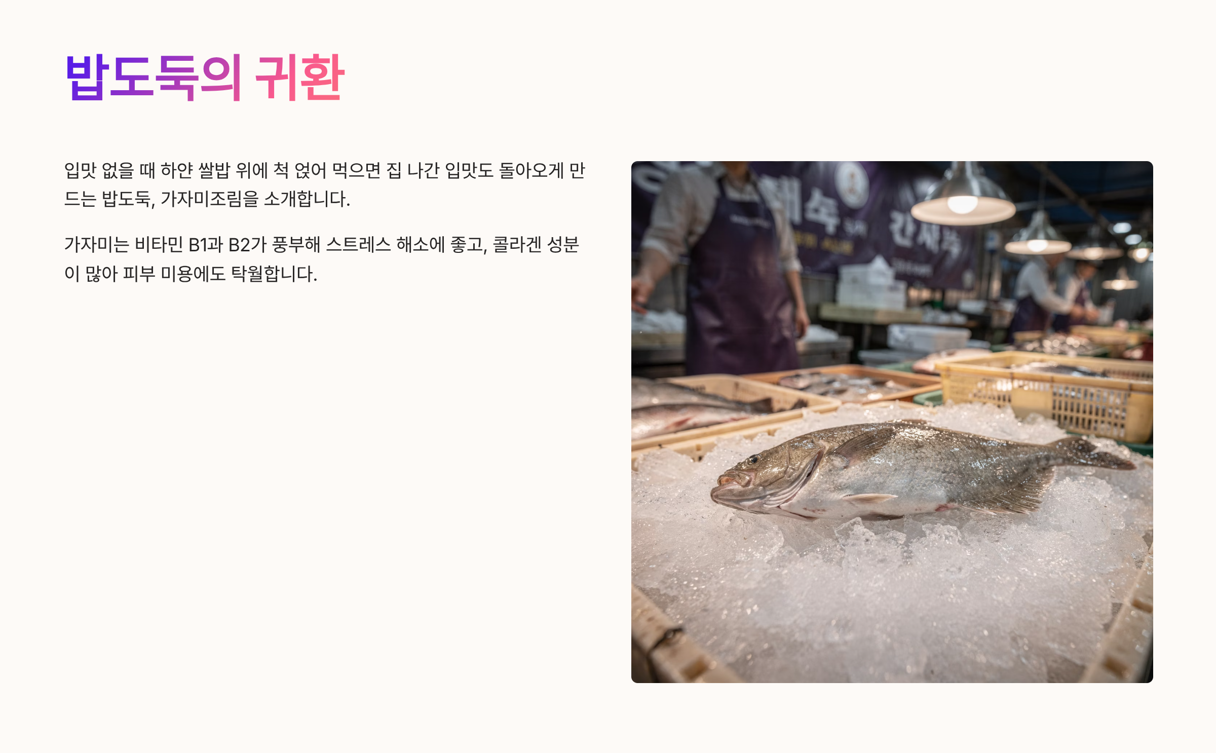 안녕하세요. 오늘은 입맛 없을 때 하얀 쌀밥 위에 척 얹어 먹으면 집 나간 입맛도 돌아오게 만드는 밥도둑, 가자미조림 황금레시피를 준비했습니다. 가자미는 비타민 B1과 B2가 풍부해 스트레스 해소에 좋고, 콜라겐 성분이 많아 피부 미용에도 탁월한 효능을 가진 생선입니다. 특히 살이 부드럽고 담백해서 아이들도 잘 먹는 생선 중 하나죠.